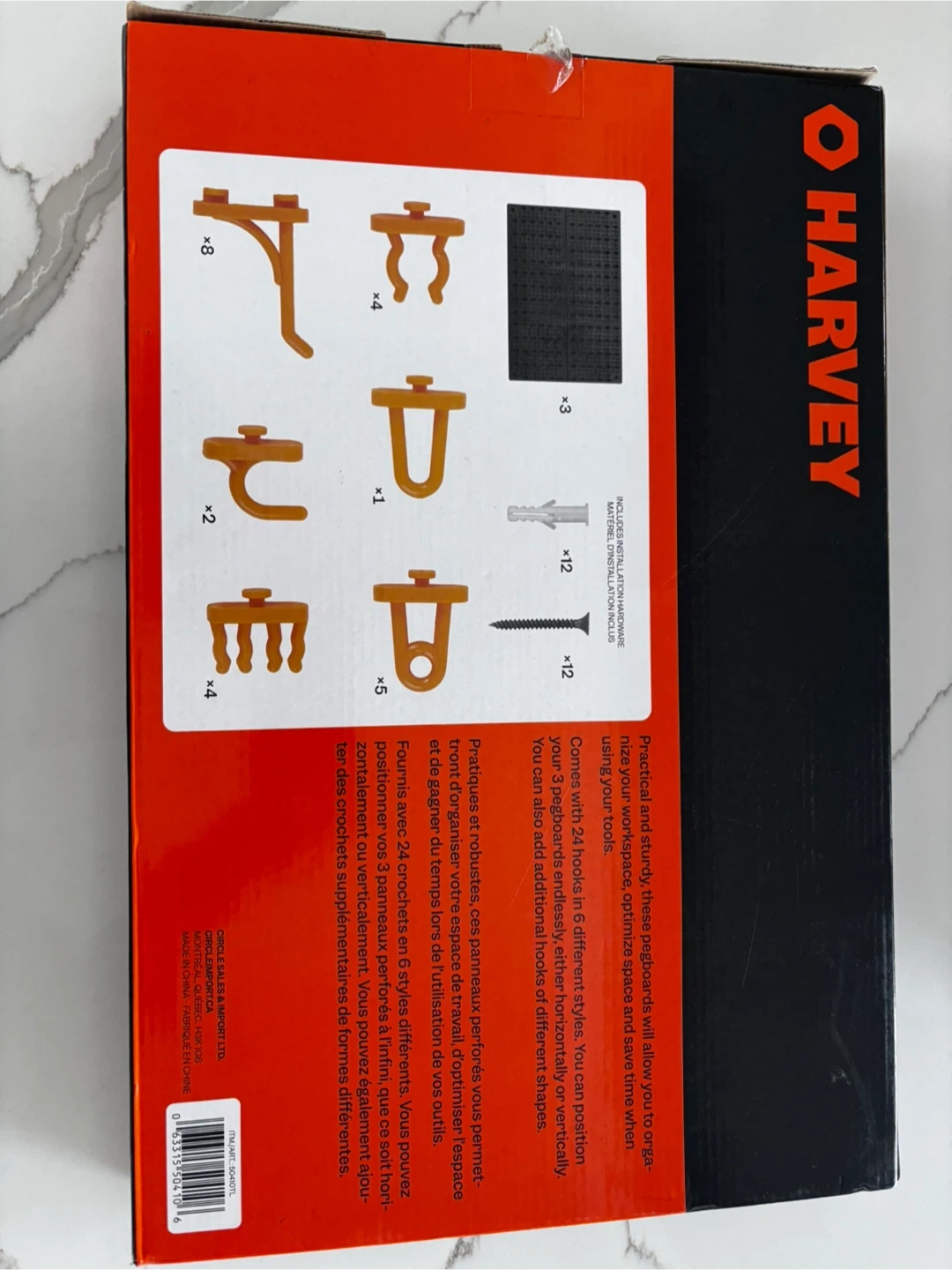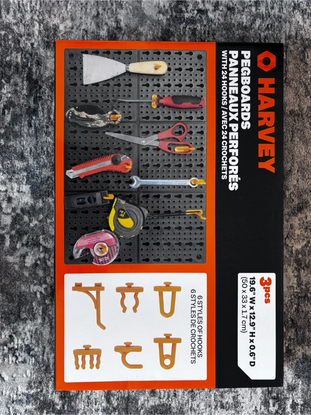 This is a 3-piece set of HARVEY pegboards that comes with 24 hooks in 6 different styles. The pegboards measure 19.6" W x 12.9" H x 0.6" D (50 x 33 x 1.7 cm). They're great for organizing your tools and supplies!