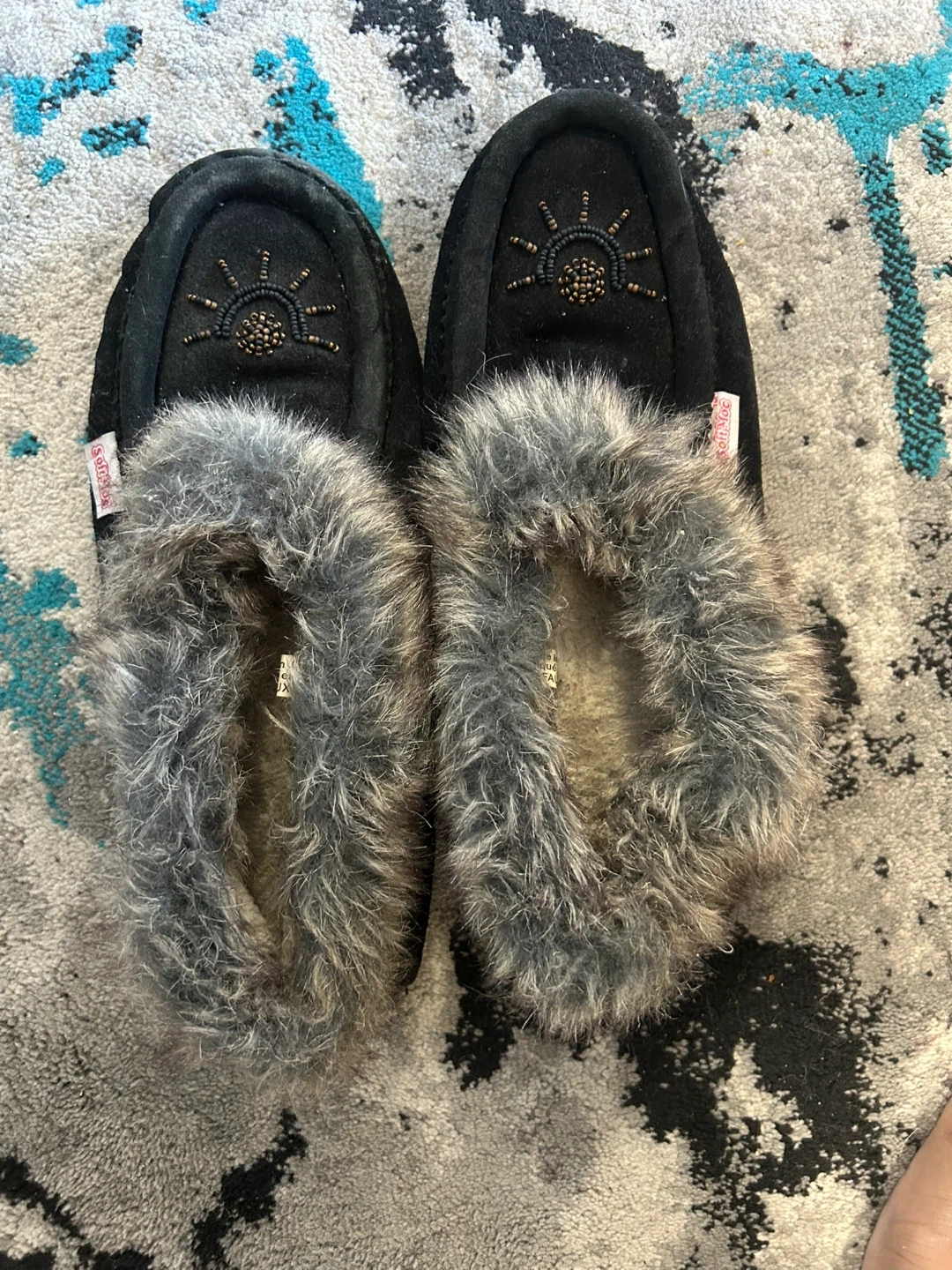 These SOREL moccasin slippers are black suede with a decorative beaded sun design. They feature cozy grey faux fur trim and a soft lining. Perfect for keeping your feet warm around the house!