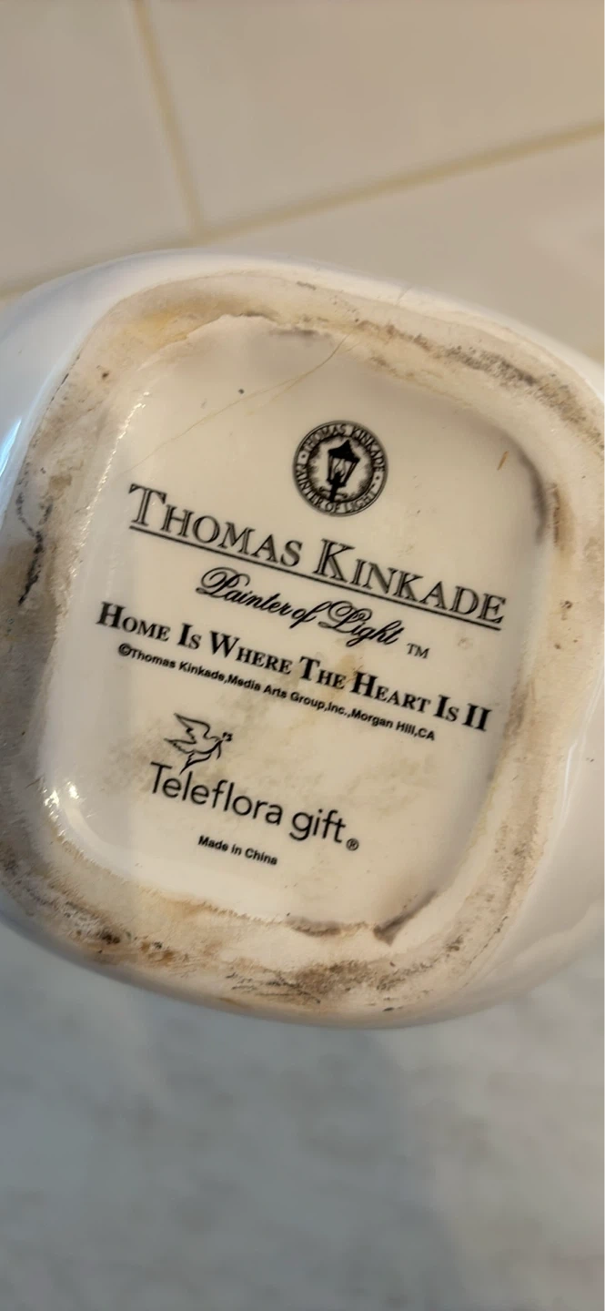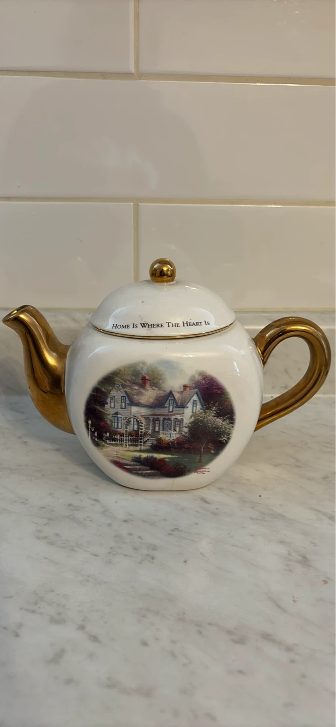 This decorative teapot features a scenic painting and the inscription "Home Is Where The Heart Is". It's part of the Thomas Kinkade "Painter of Light" collection, designated as a Teleflora gift. Ceramic material with gold-toned spout and handle.