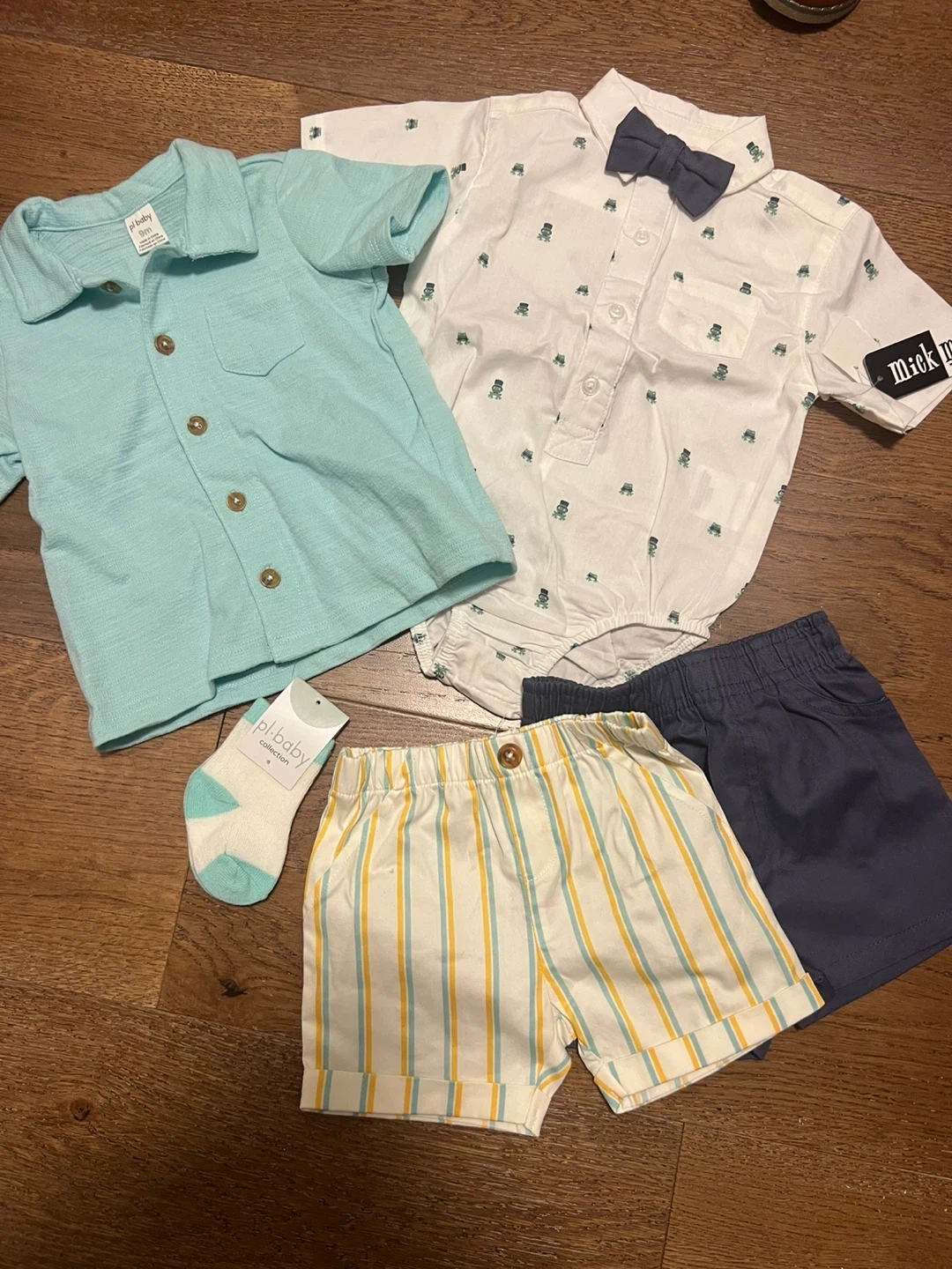 This sweet baby boy outfit set includes a light blue short-sleeved collared shirt and a white romper with a frog print and a navy bow tie. It also comes with striped shorts, navy shorts, and a pair of white and teal socks. This set is perfect for a special occasion or everyday wear!