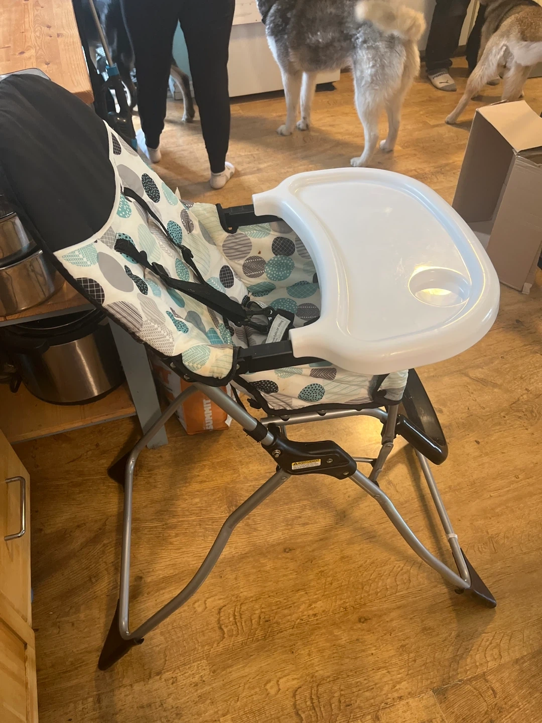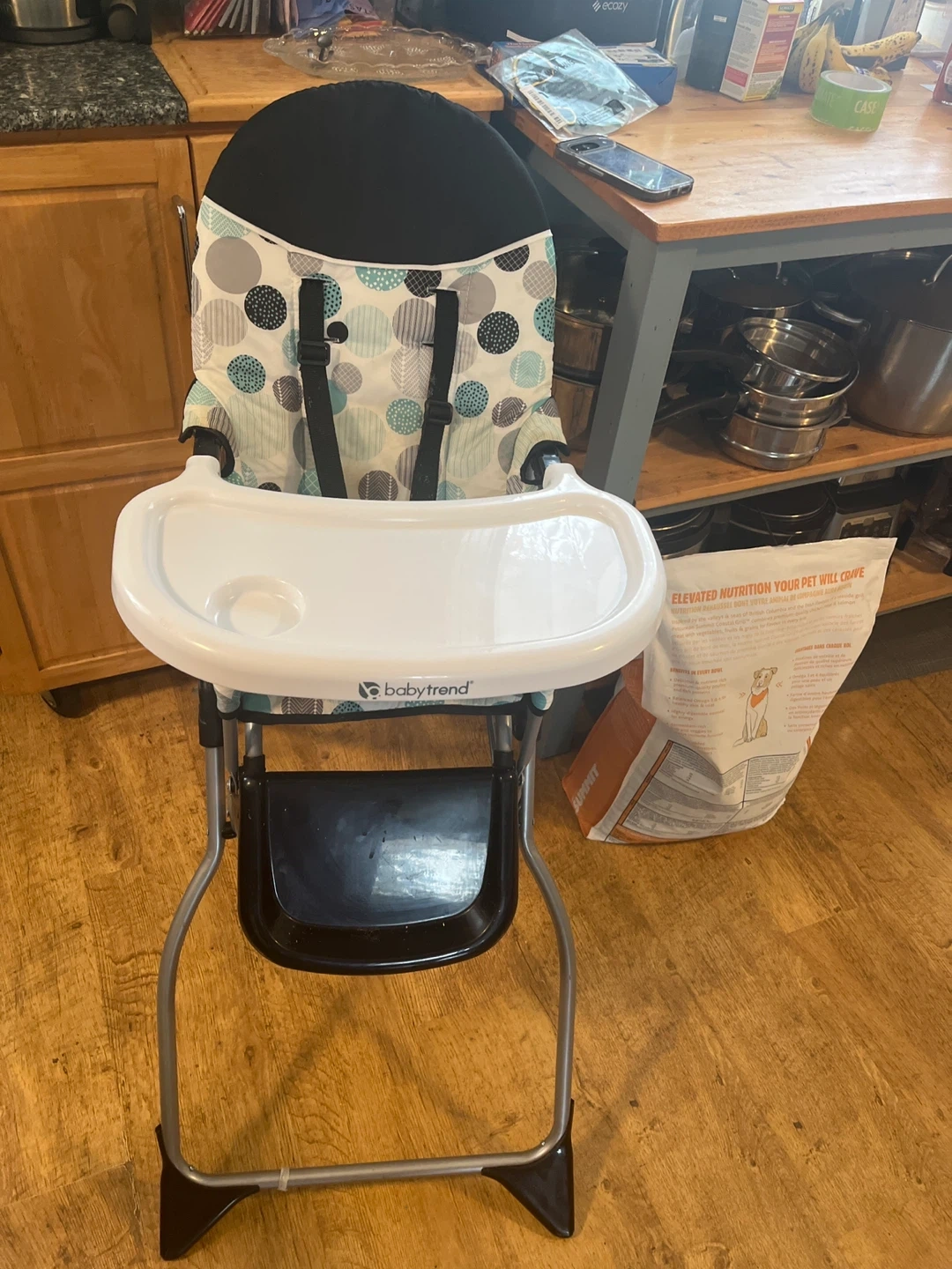 This is a Baby Trend Fastfold High Chair. It has a removable tray and a 5-point harness for safety. The fabric seat is patterned with grey, white, teal, and blue circles. It's easy to fold for storage.