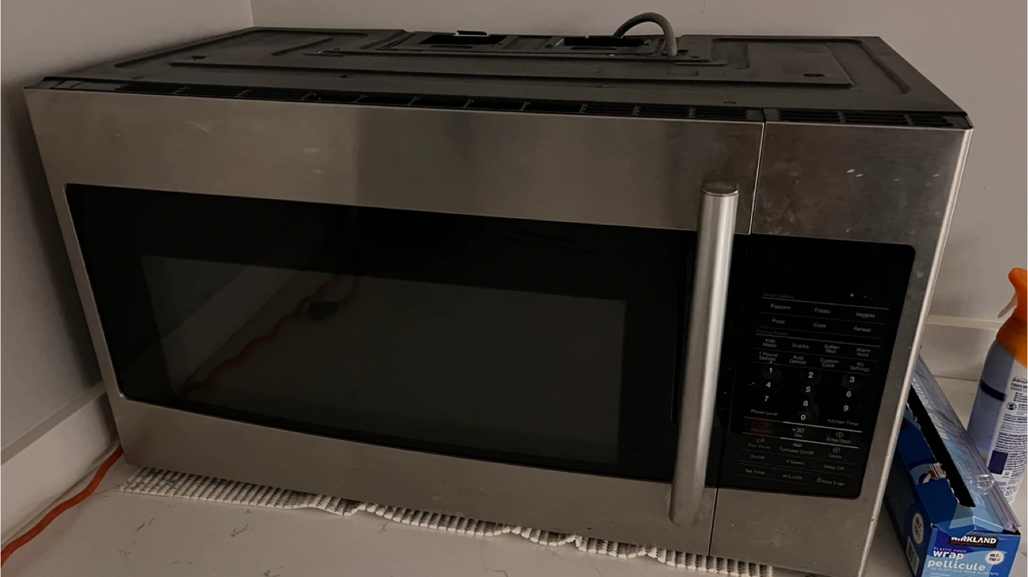 This stainless steel over-the-range microwave features a digital control panel with various cooking presets. It includes common settings like popcorn, potato, and reheat. The unit has a standard door handle and a dark glass door.