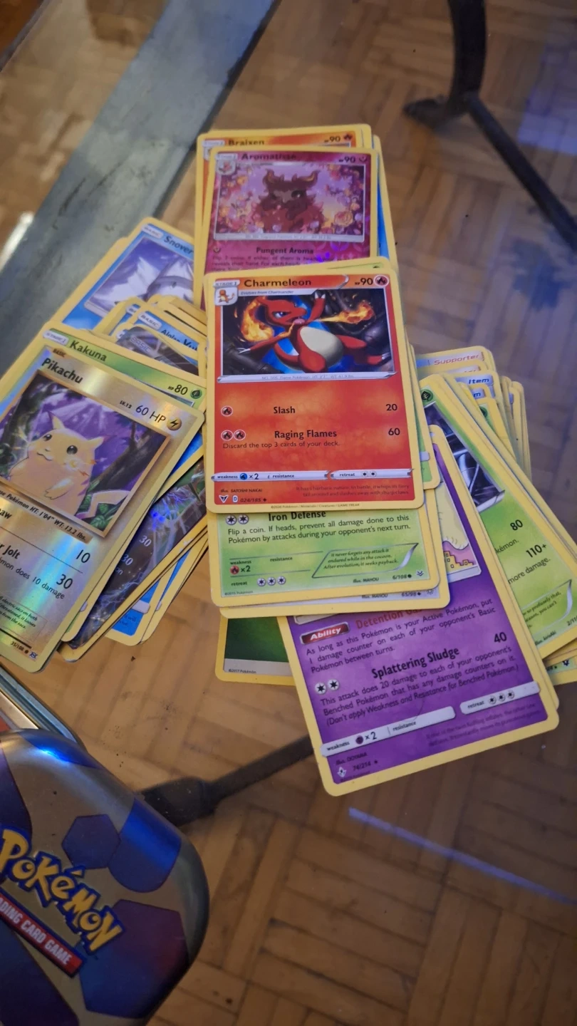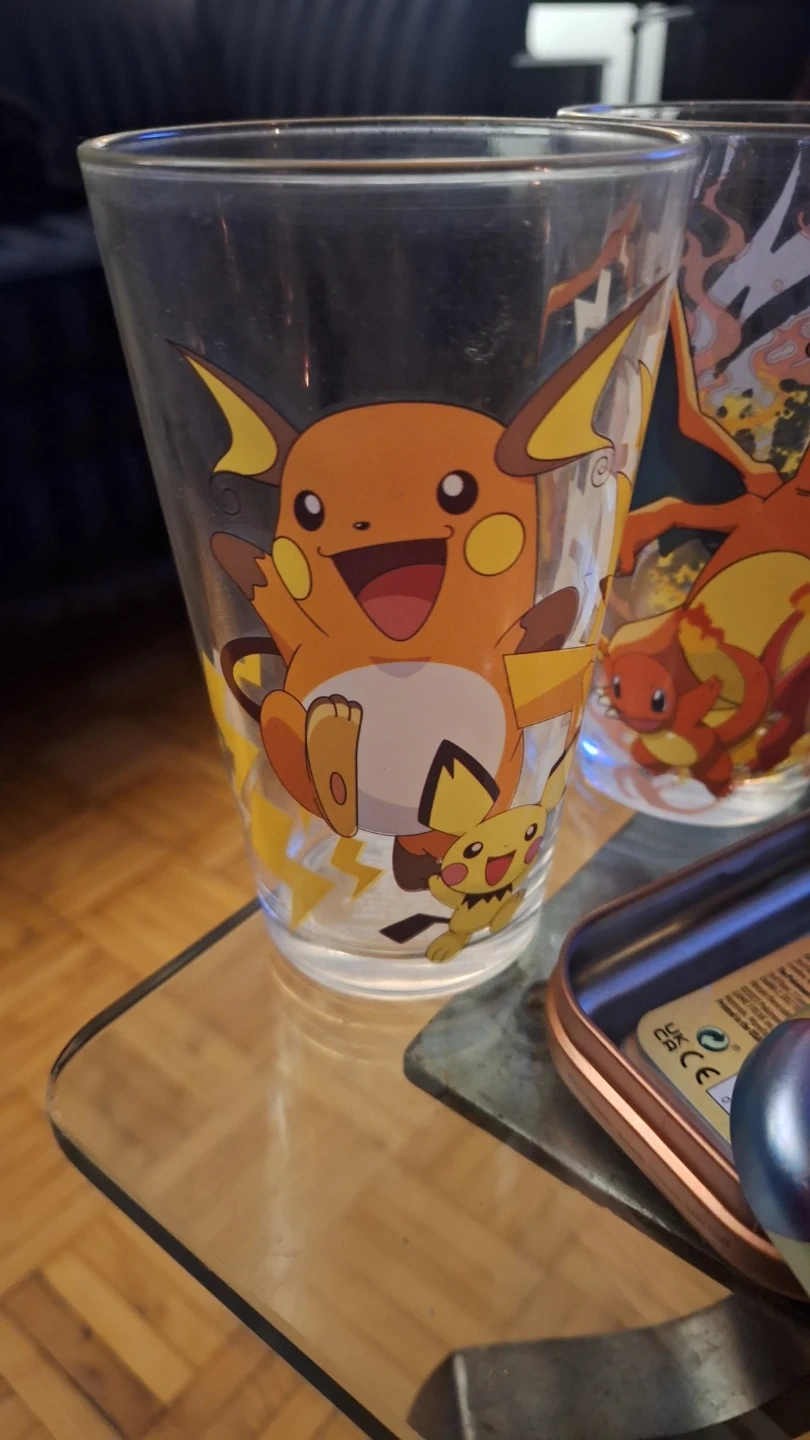 Set of two Pokemon glasses featuring Charizard and Pikachu. Also includes a Pokemon trading card tin. Great for any fan of the series! And cards