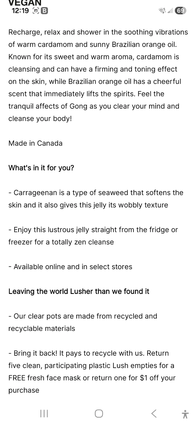 This Lush Gong shower jelly offers a spicy cardamom and warm aroma experience. It's known for its cleansing properties. Enjoy this lustrous jelly straight from the fridge or freezer for a refreshing cleanse!