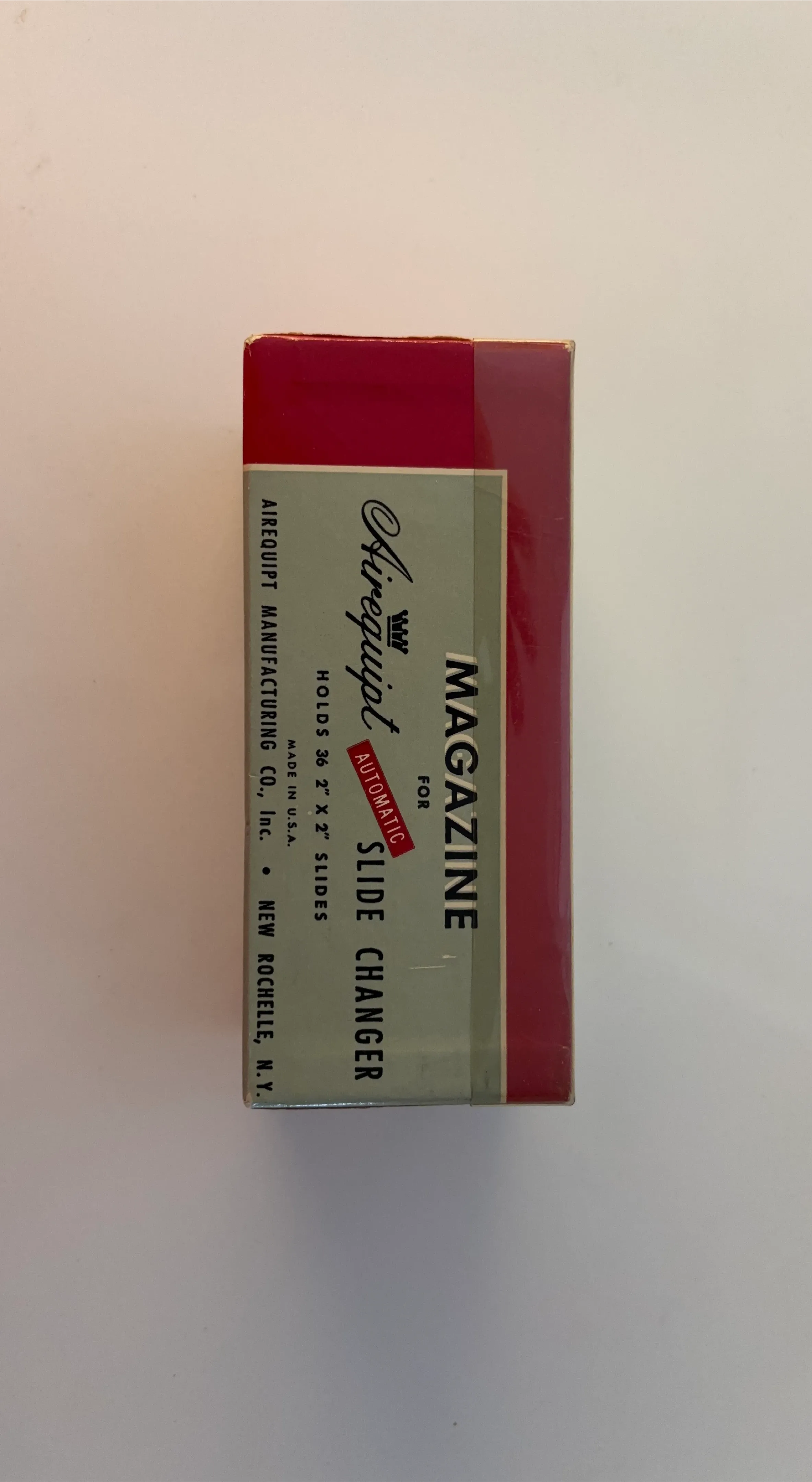 Vintage Airequipt automatic slide magazine for 2x2 slides. The magazine holds 36 slides and comes with the original box. Qty. 12, $2 each.