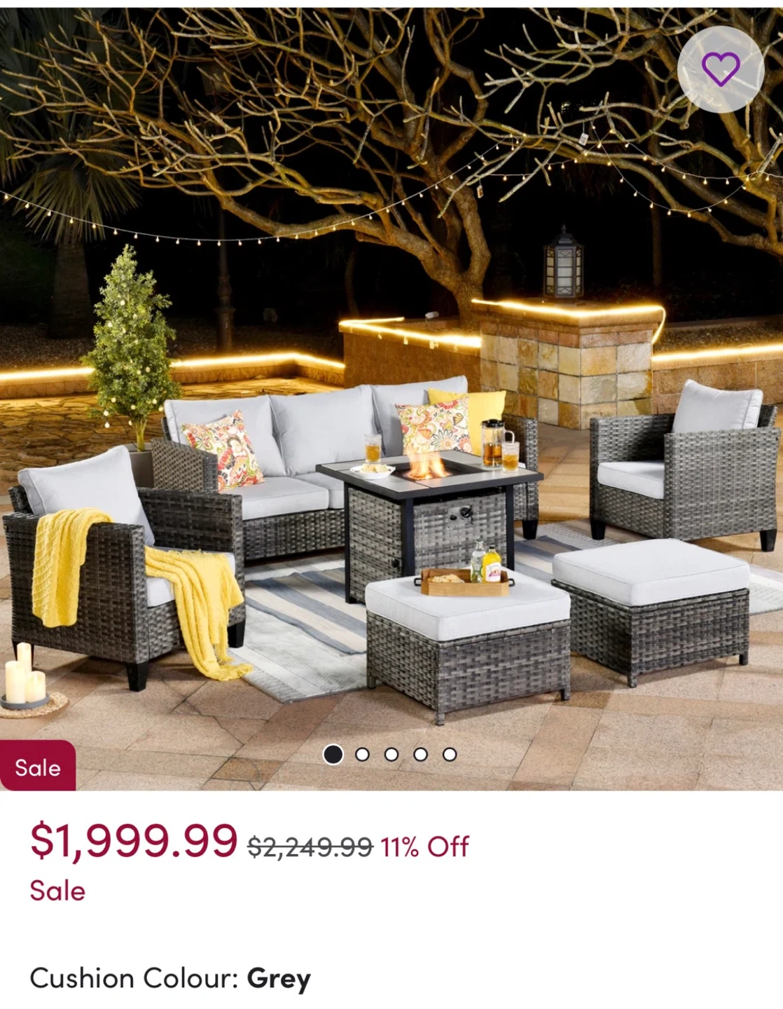 Selling a lovely outdoor patio set, perfect for enjoying those summer evenings! The set includes a sofa, chair, ottoman, and a fire table to keep you warm. The cushions are a neutral grey.