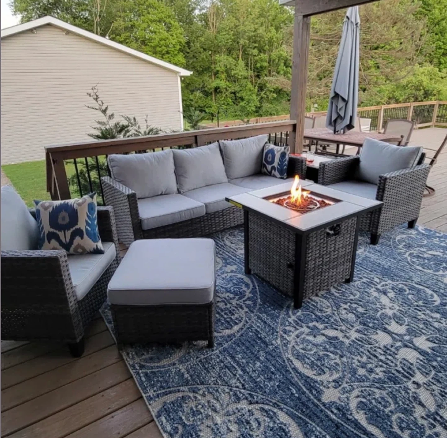 Selling a lovely outdoor patio set, perfect for enjoying those summer evenings! The set includes a sofa, chair, ottoman, and a fire table to keep you warm. The cushions are a neutral grey.