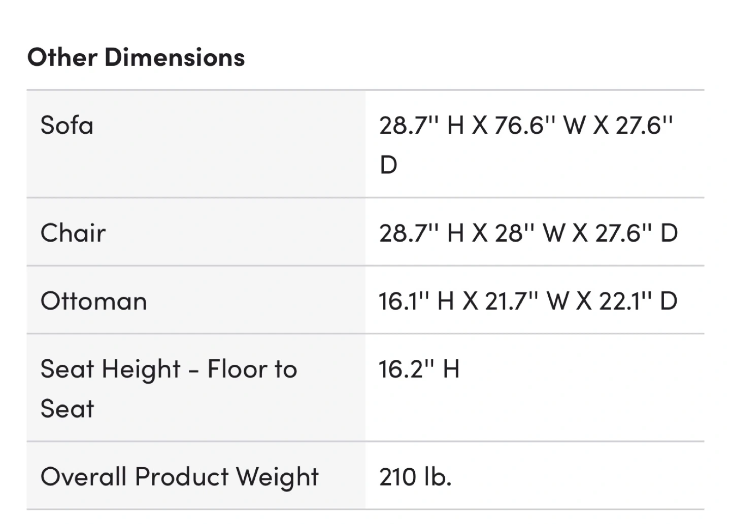 Sofa dimensions: 28.7" H x 76.6" W x 27.6" D
