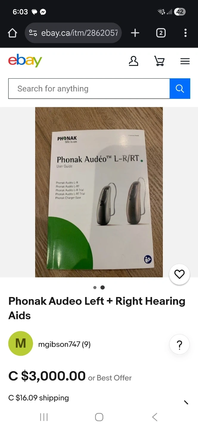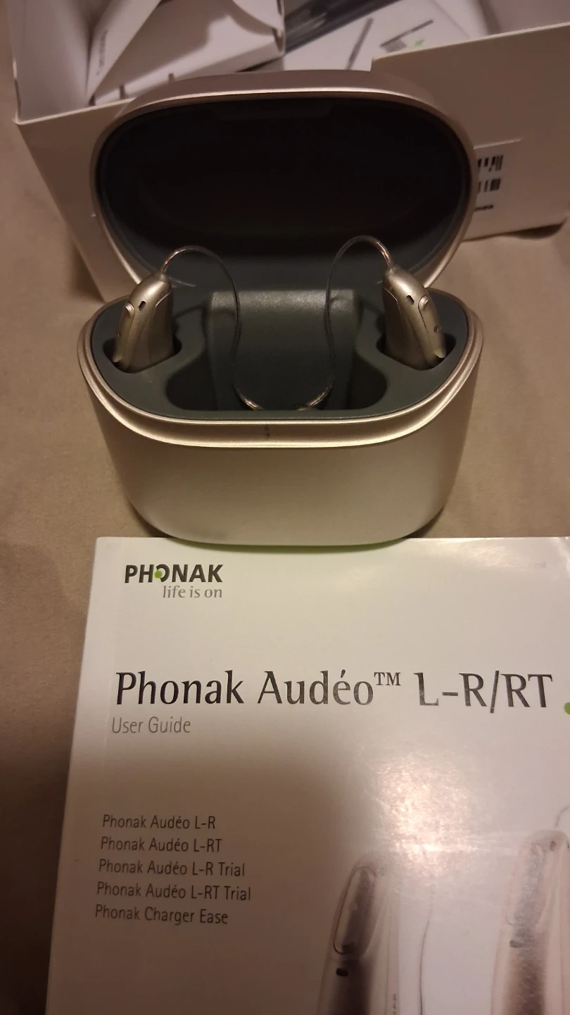 These are Phonak Audeo L-R/RT hearing aids. The set includes the hearing aids, charging case, user guide, and charging accessories. It's a complete set for hearing assistance.