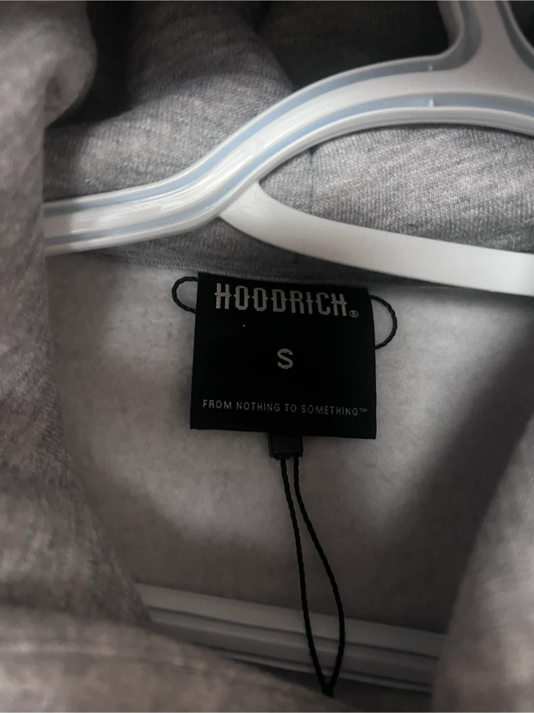This is a grey Hoodrich hoodie in size small. It's made from a soft material. The design features "HOODRICH" across the chest and text on the hood.