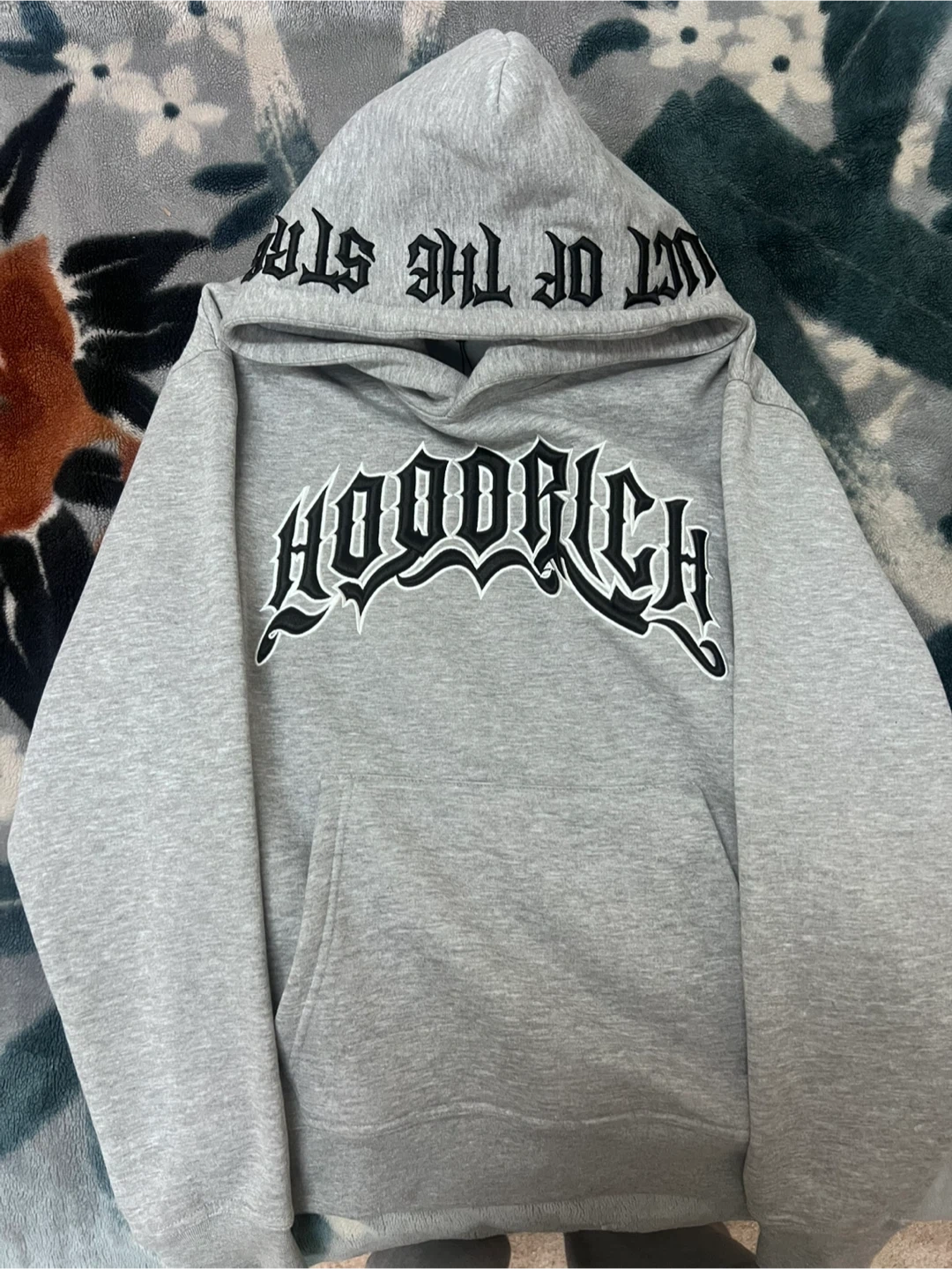 This is a grey Hoodrich hoodie in size small. It's made from a soft material. The design features "HOODRICH" across the chest and text on the hood.