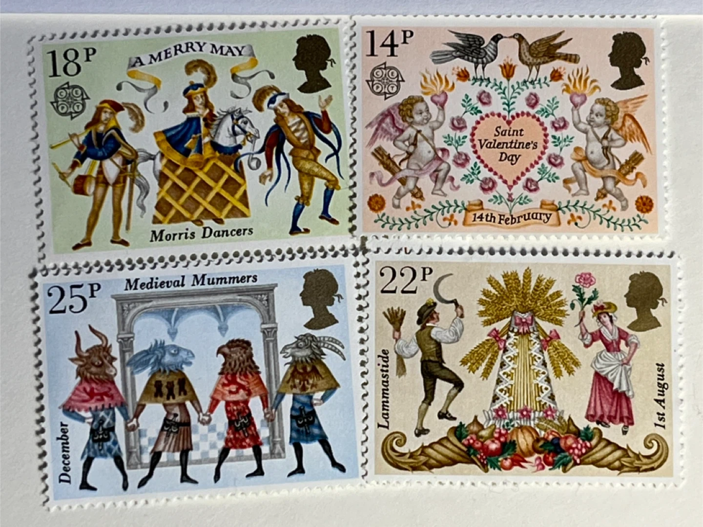 The stamps are mint, featuring illustrations of Morris Dancers, Saint Valentine's Day, Medieval Mummers, and Lammastide.