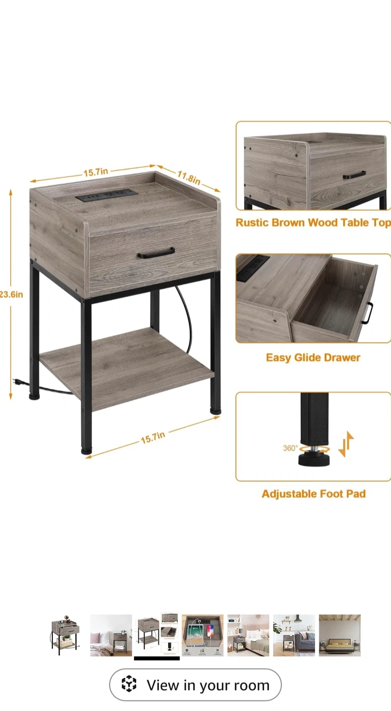 This end table features a rustic brown wood finish with a convenient drawer for storage. It includes a built-in charging station with USB ports and AC outlets. The table also has an open shelf below and adjustable foot pads for stability. Dimensions are 15.7" W x 11.8" D x 23.6" H.