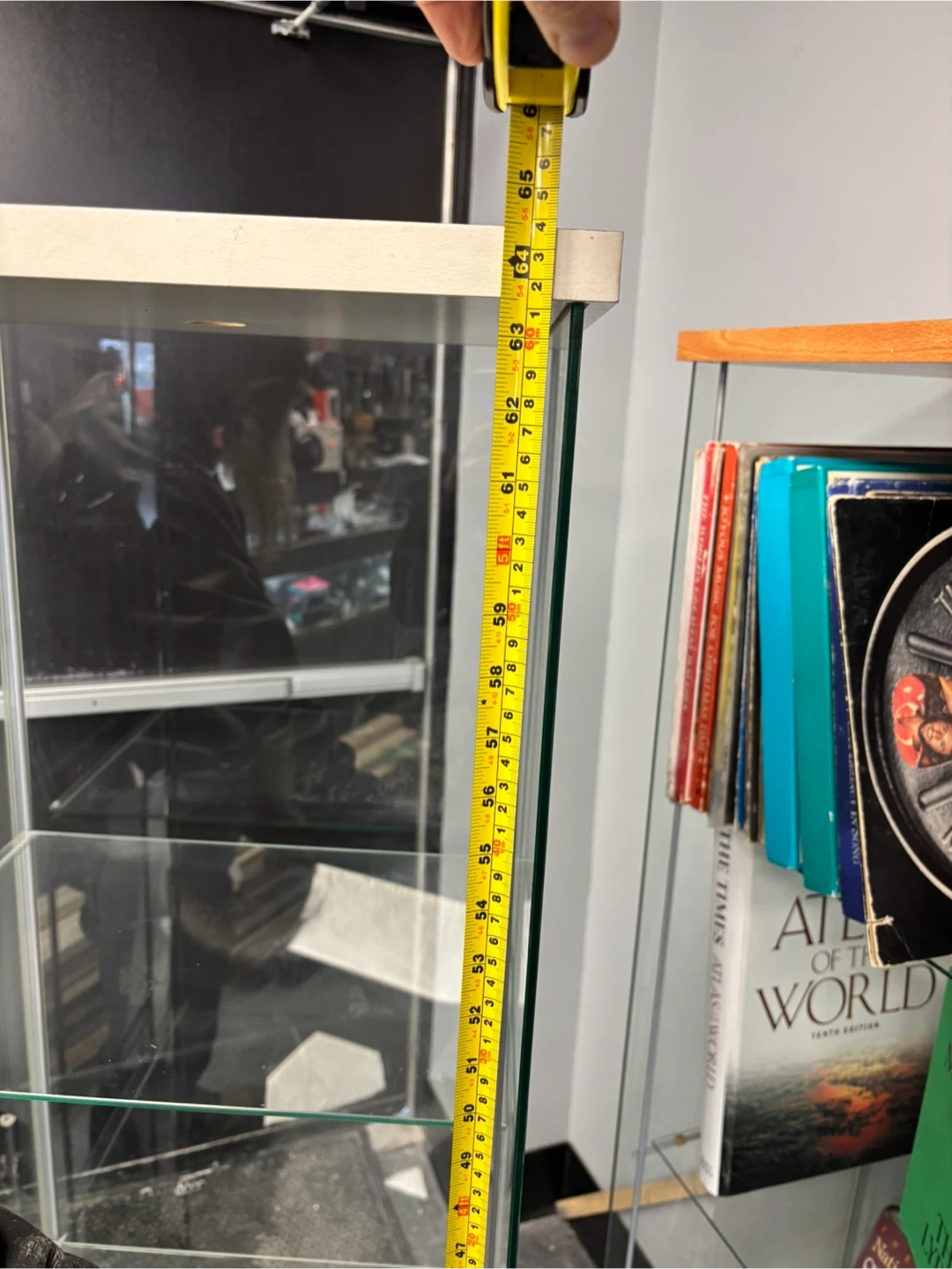 This is a tall glass display cabinet. It has four glass shelves and a white top and base. It's about 63 inches tall. This cabinet is great for showcasing collectibles or merchandise!