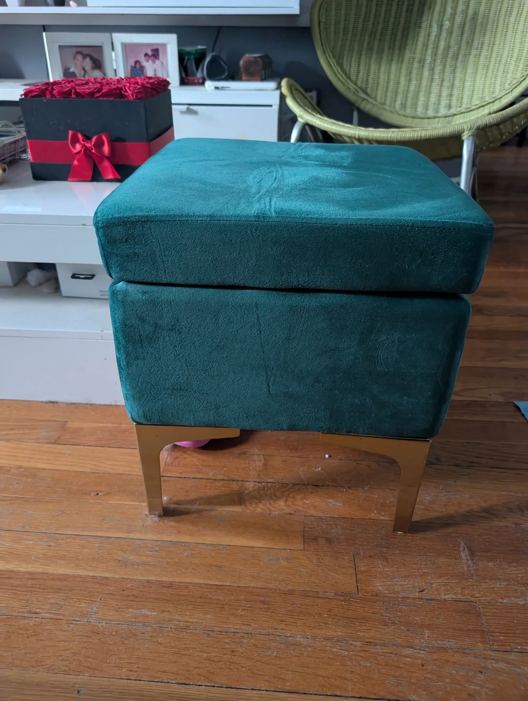 This teal velvet ottoman offers convenient storage and a touch of modern style. Its plush velvet upholstery feels soft to the touch. Gold-toned metal legs provide a sturdy base.