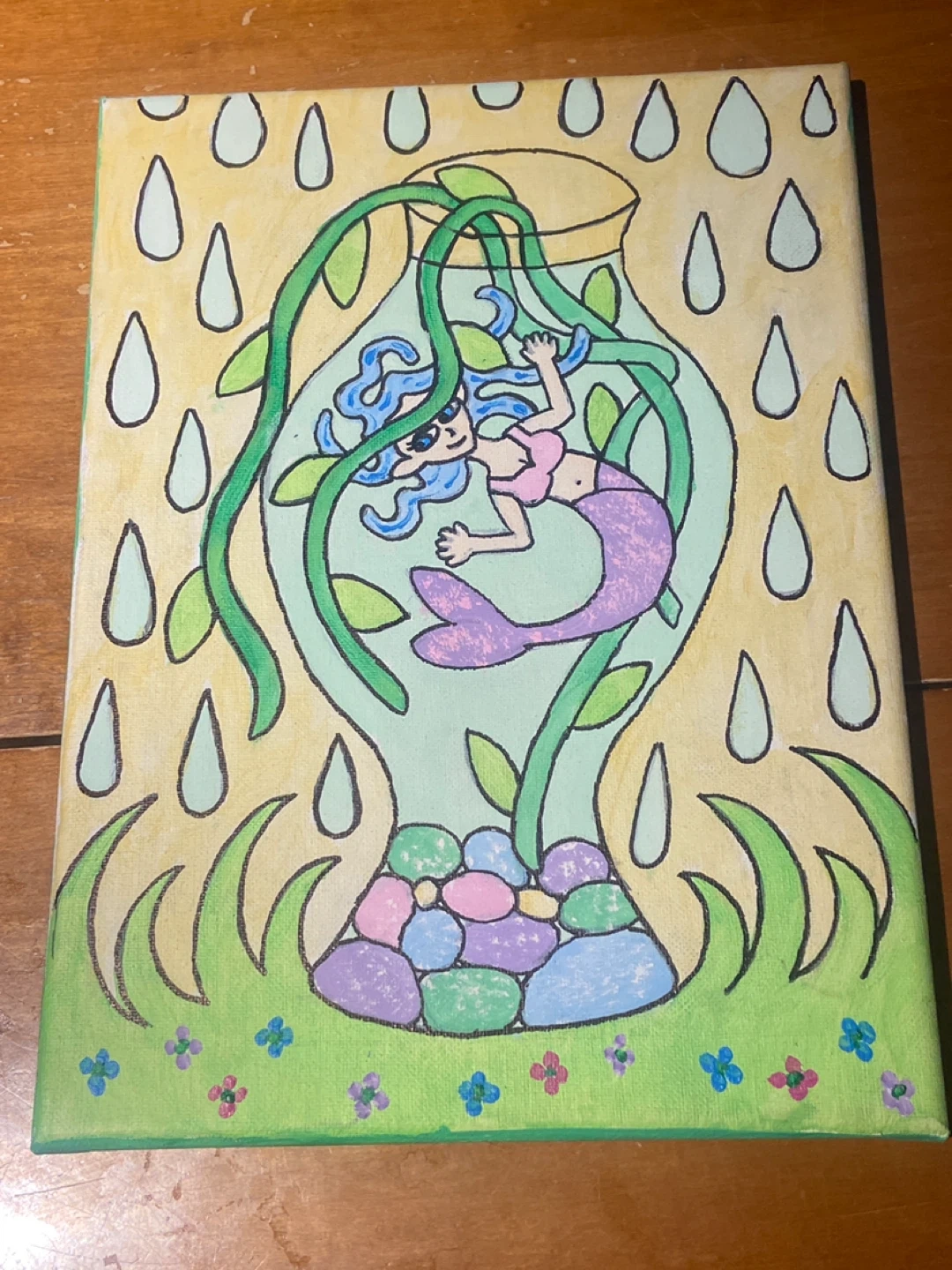This is a handmade acrylic painting on canvas featuring a whimsical mermaid inside a glass vase, surrounded by rain. The artwork is 8x10 inches. It's a unique piece for decoration!