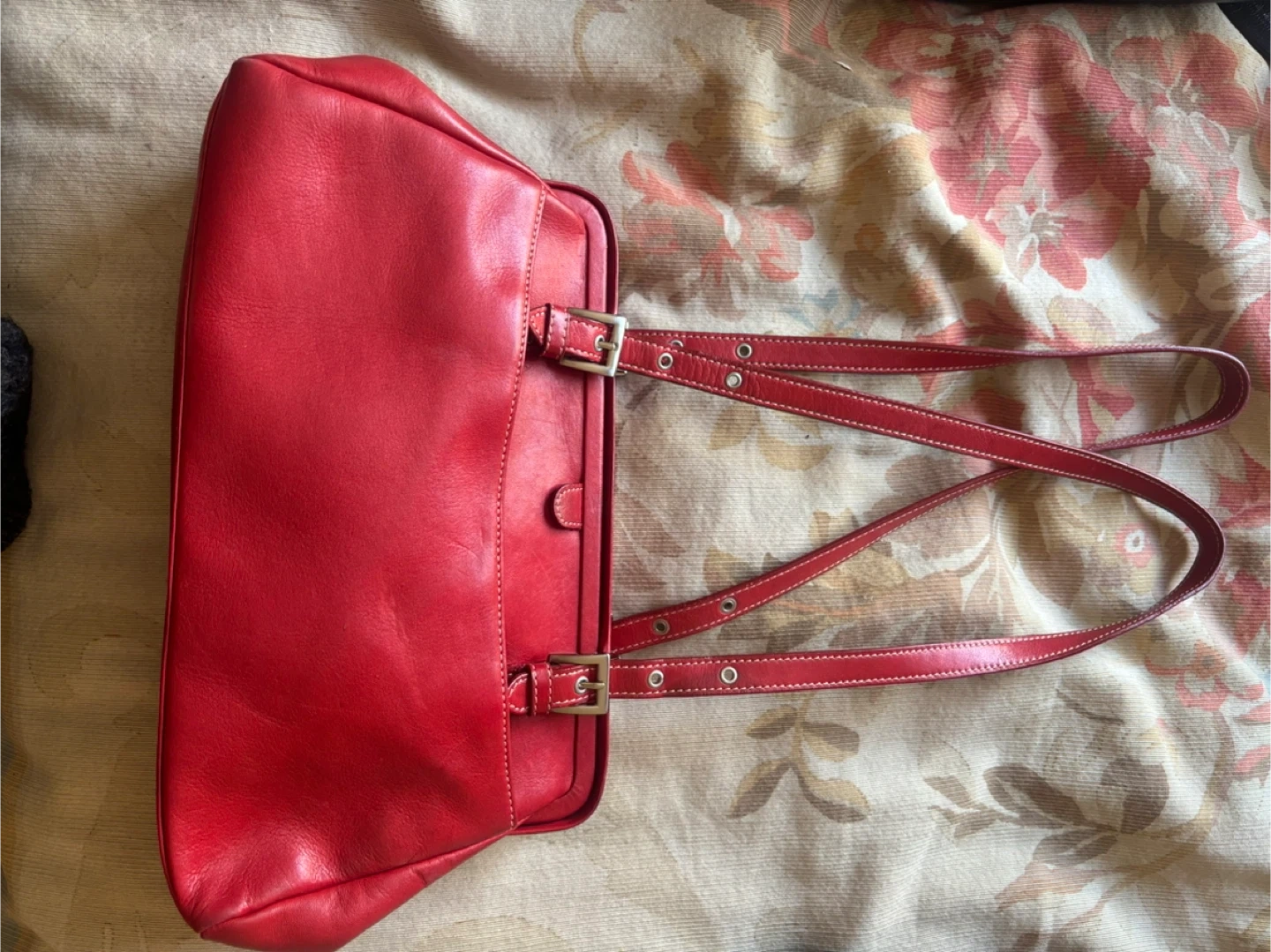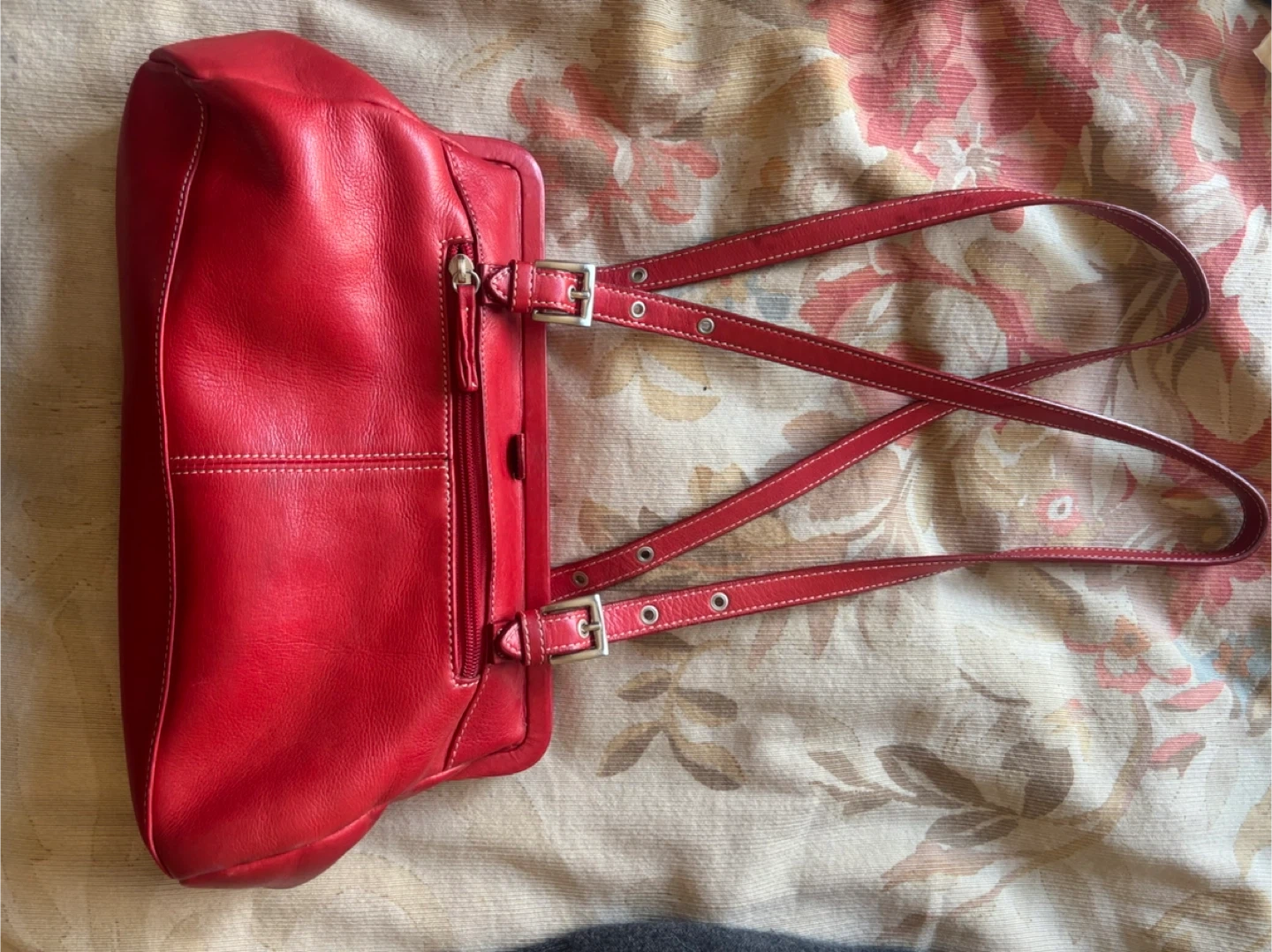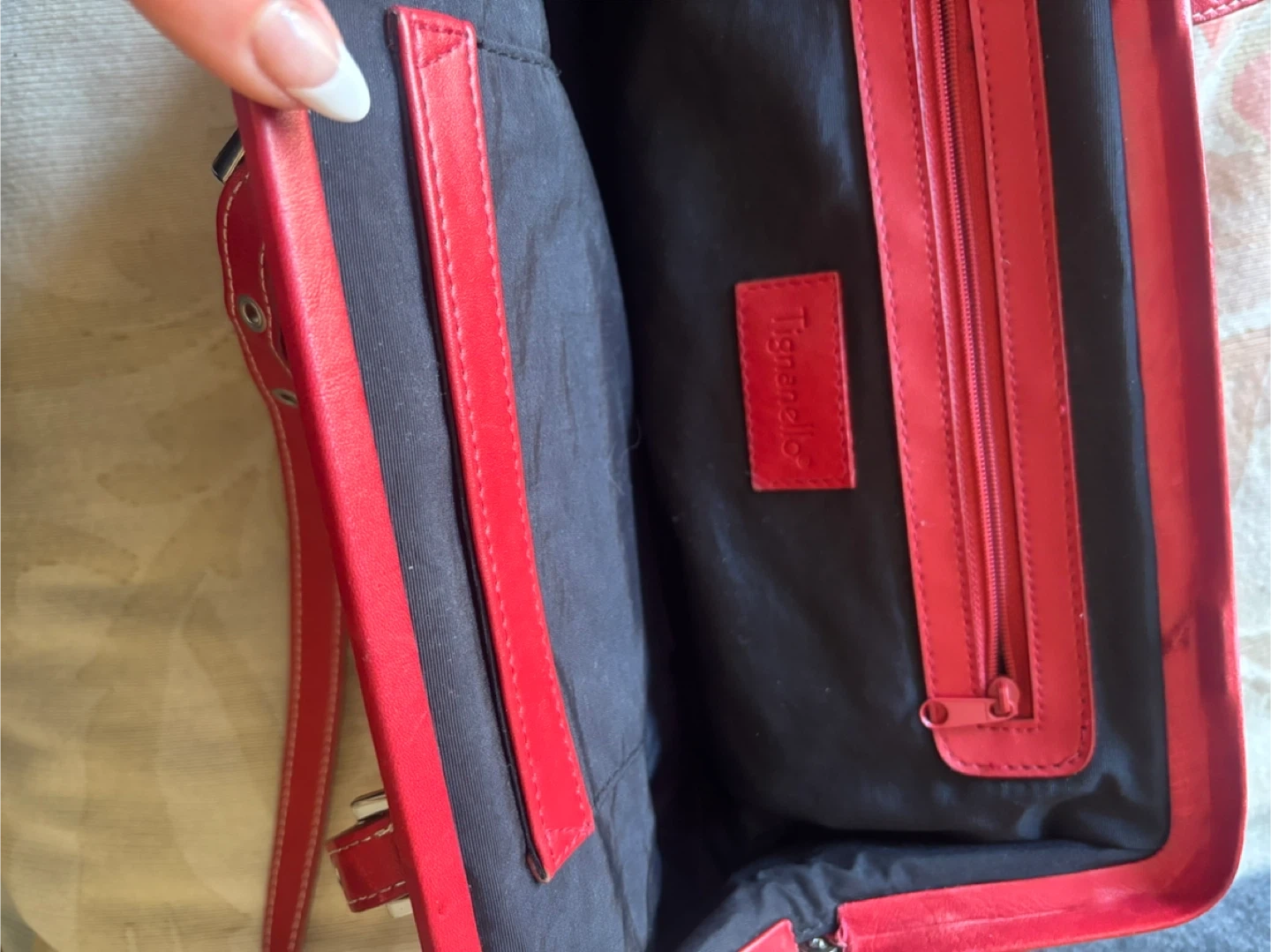 This Tignanello shoulder bag is made of red leather. It features double straps with buckle detailing and a zippered compartment. A classic accessory for any outfit! New condition.
