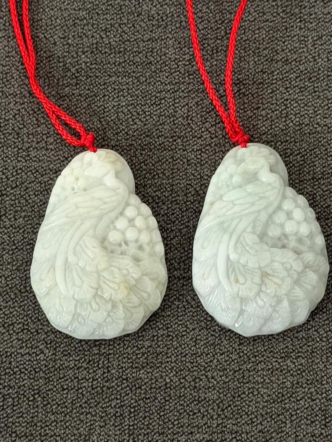 Two carved jade pendants featuring a phoenix and floral motifs. Each comes with a red cord for hanging. These pieces showcase intricate detailing and a smooth, polished finish.