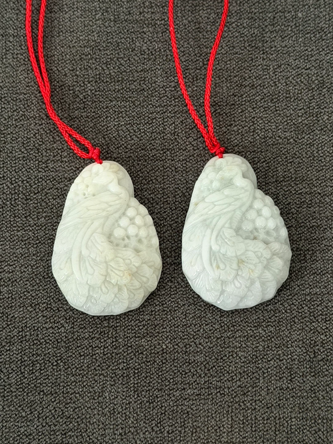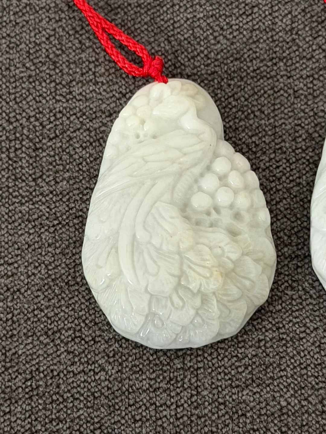 Two carved jade pendants featuring a phoenix and floral motifs. Each comes with a red cord for hanging. These pieces showcase intricate detailing and a smooth, polished finish.
