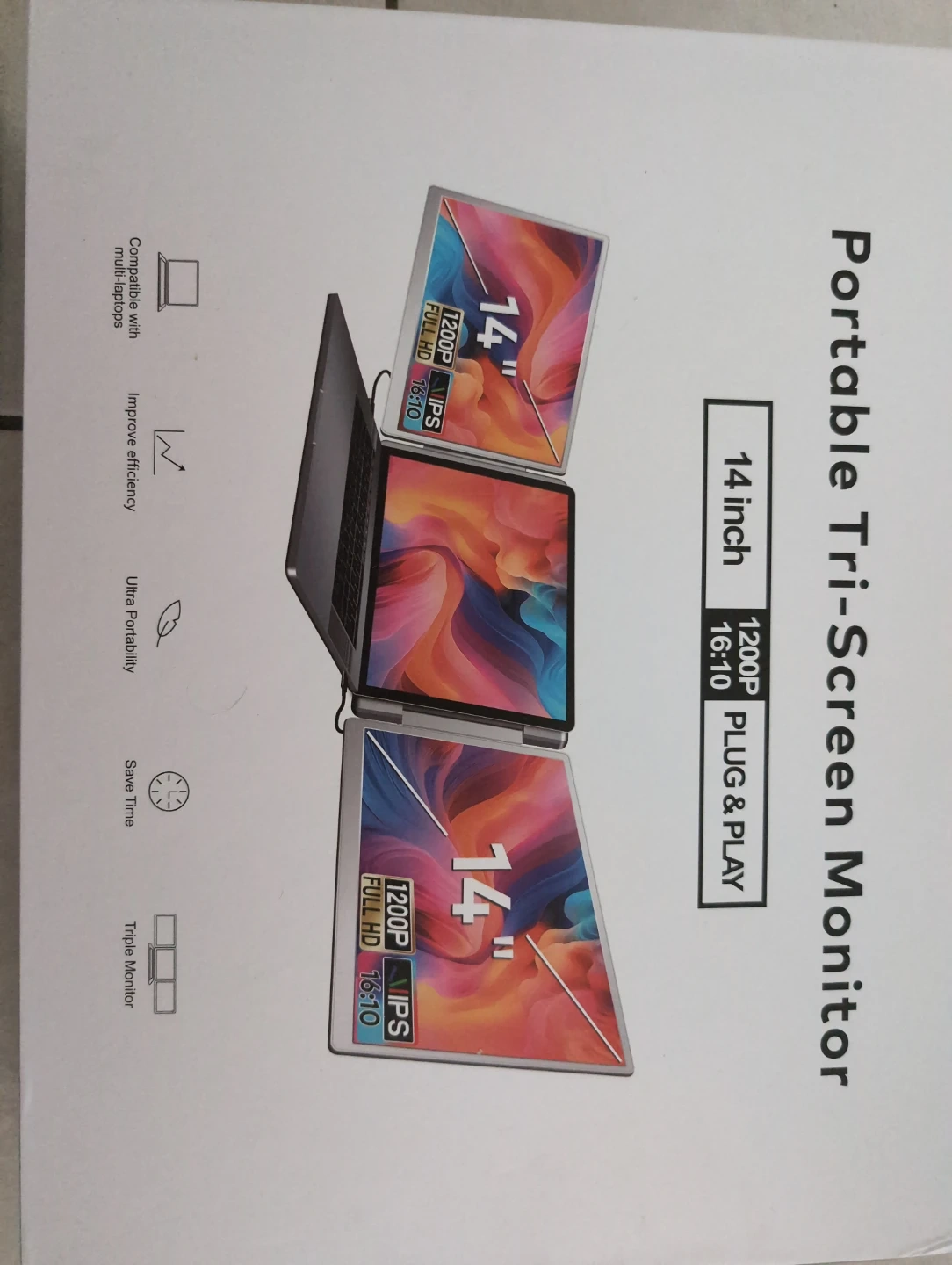 This is a portable tri-screen monitor. It's 14 inches with a 1200p full HD 16:10 resolution. This monitor is plug & play and compatible with most laptops. Includes a carrying case.