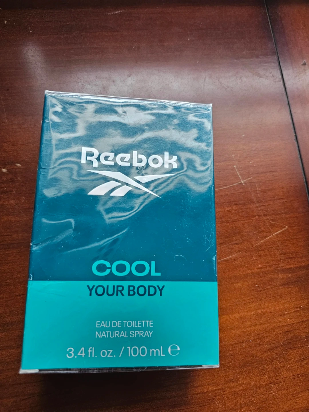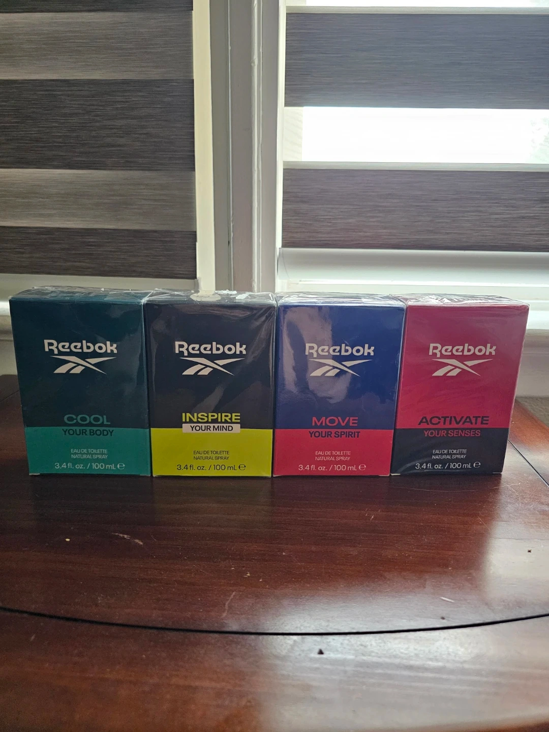 This is a collection of four Reebok Eau de Toilette Natural Spray bottles, each with a 100 mL volume. The collection includes "Cool Your Body," "Inspire Your Mind," "Move Your Spirit," and "Activate Your Senses." They're all brand new and sealed.