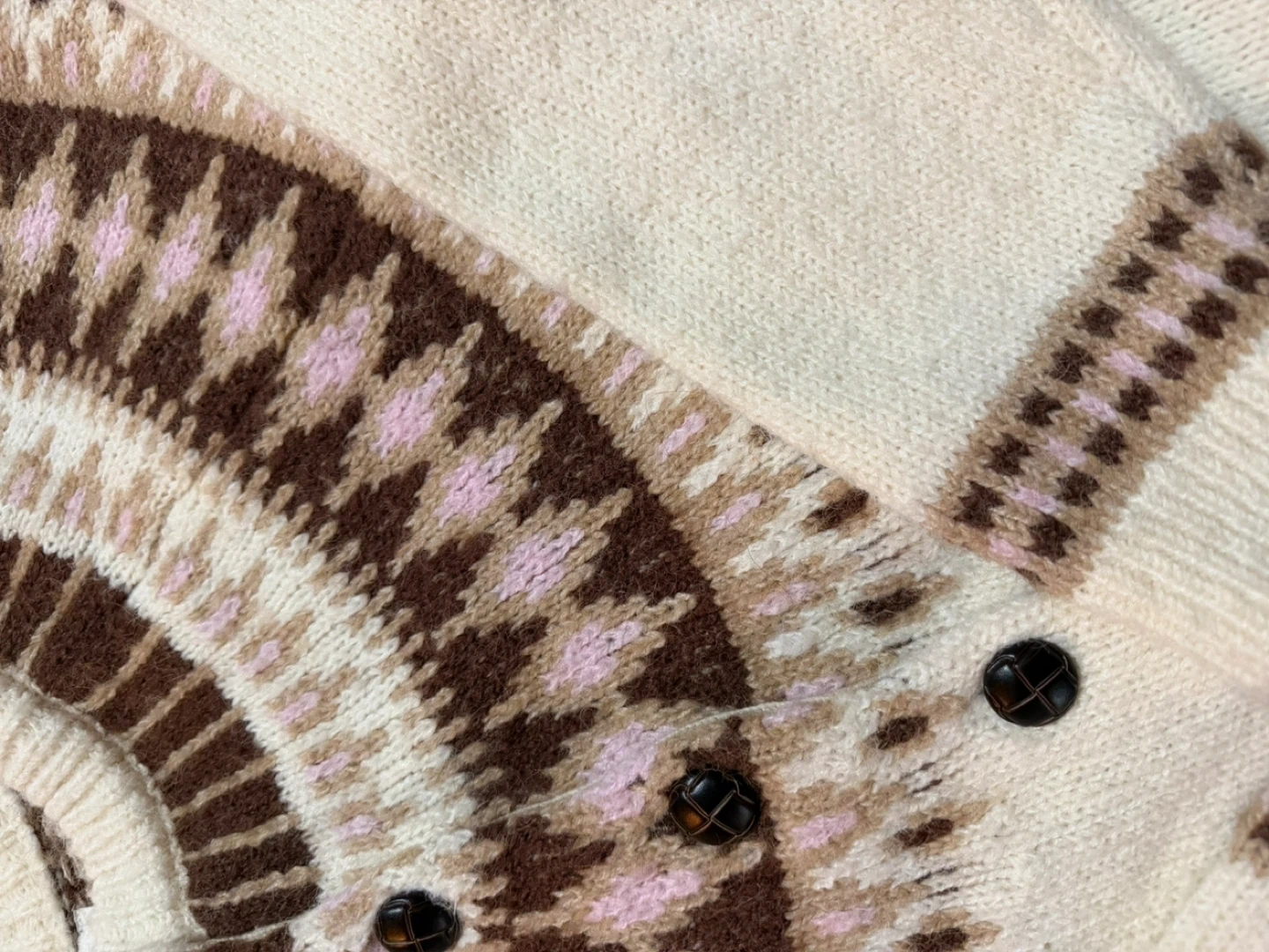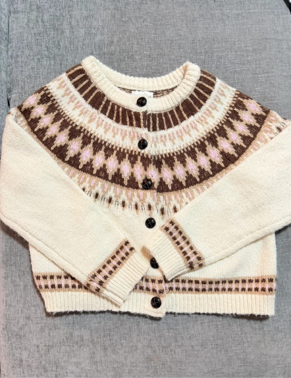 Cream knit cardigan with a brown and pink Fair Isle pattern. It has a button-up front and long sleeves. There are some faint marks on the left sleeve.