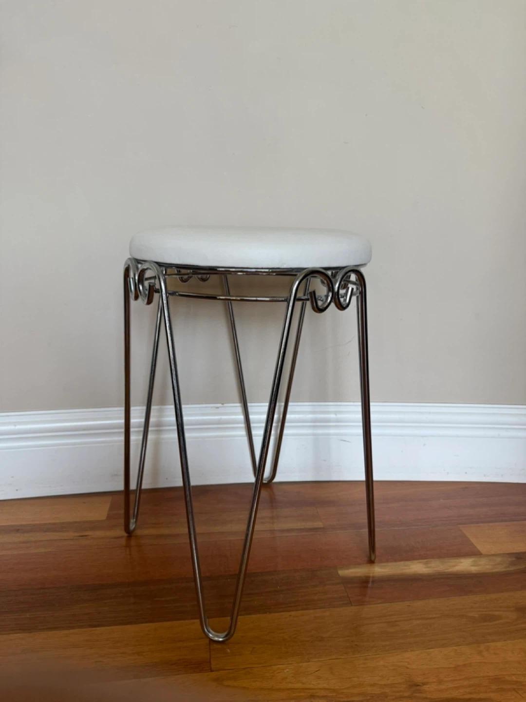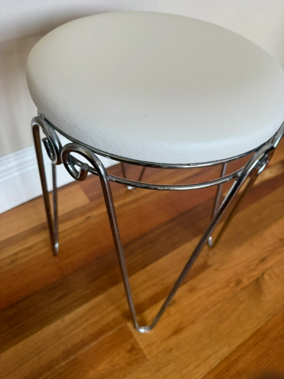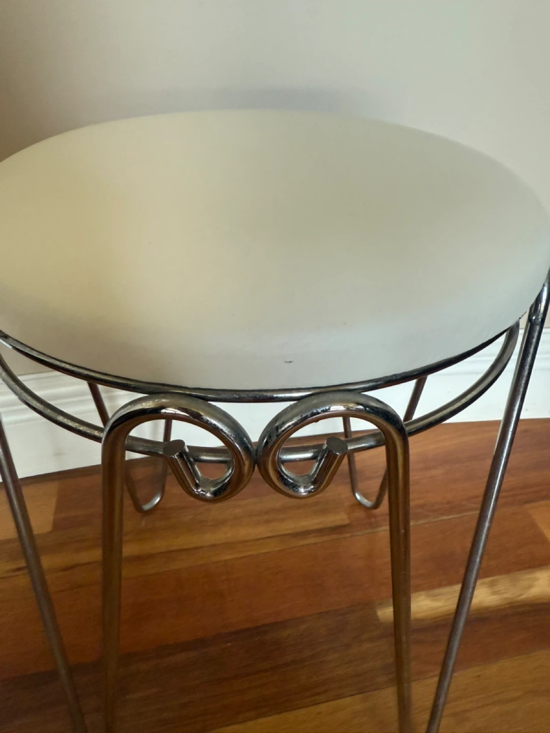 Selling a cute little stool with a sturdy chrome frame and vinyl seat (that’s more white than cream). Perfect for a small space or as an accent piece!