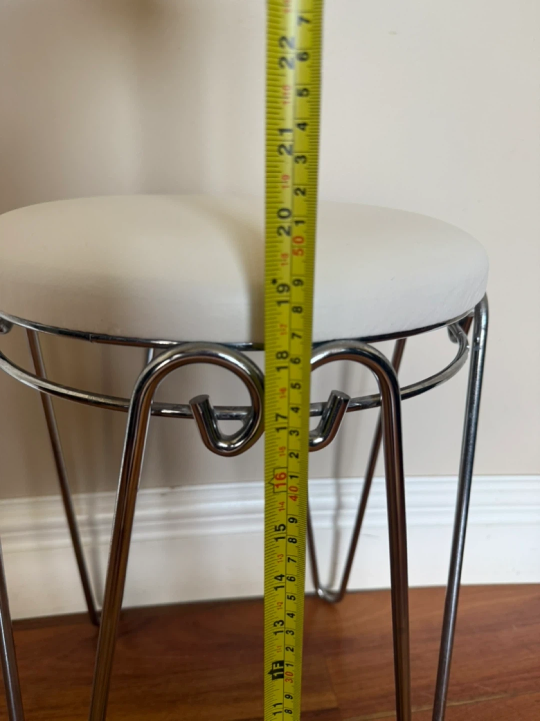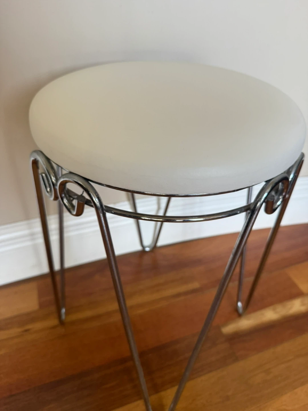 Selling a cute little stool with a sturdy chrome frame and vinyl seat (that’s more white than cream). Perfect for a small space or as an accent piece!