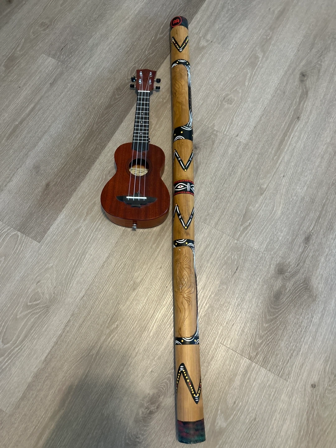 A wooden ukulele with a rich brown finish. Also includes a decorative bamboo didgeridoo featuring intricate painted patterns and carved designs. Both are unique musical instruments.