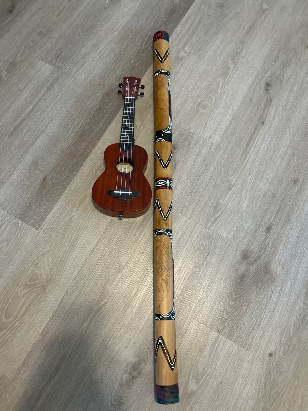 A wooden ukulele with a rich brown finish. Also includes a decorative bamboo didgeridoo featuring intricate painted patterns and carved designs. Both are unique musical instruments.