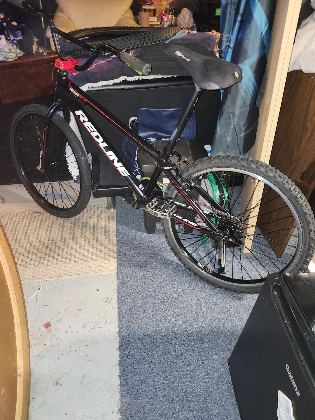 This is a black Redline BMX bike. It features a sturdy frame and a comfortable seat. This bike is great for trails or park riding!