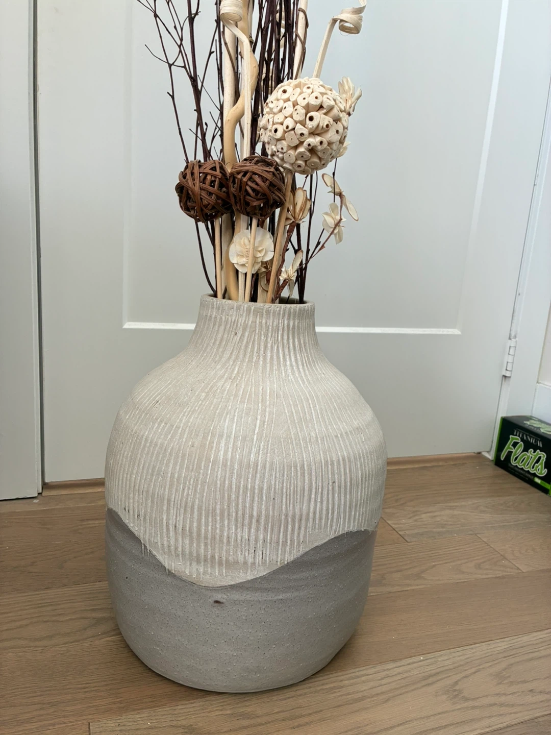 This is a large ceramic vase with a two-tone grey and beige finish. It comes with a generous arrangement of dried decorative stems and natural elements. The vase has a textured ribbed design on the upper portion. It's a nice accent piece for any room!