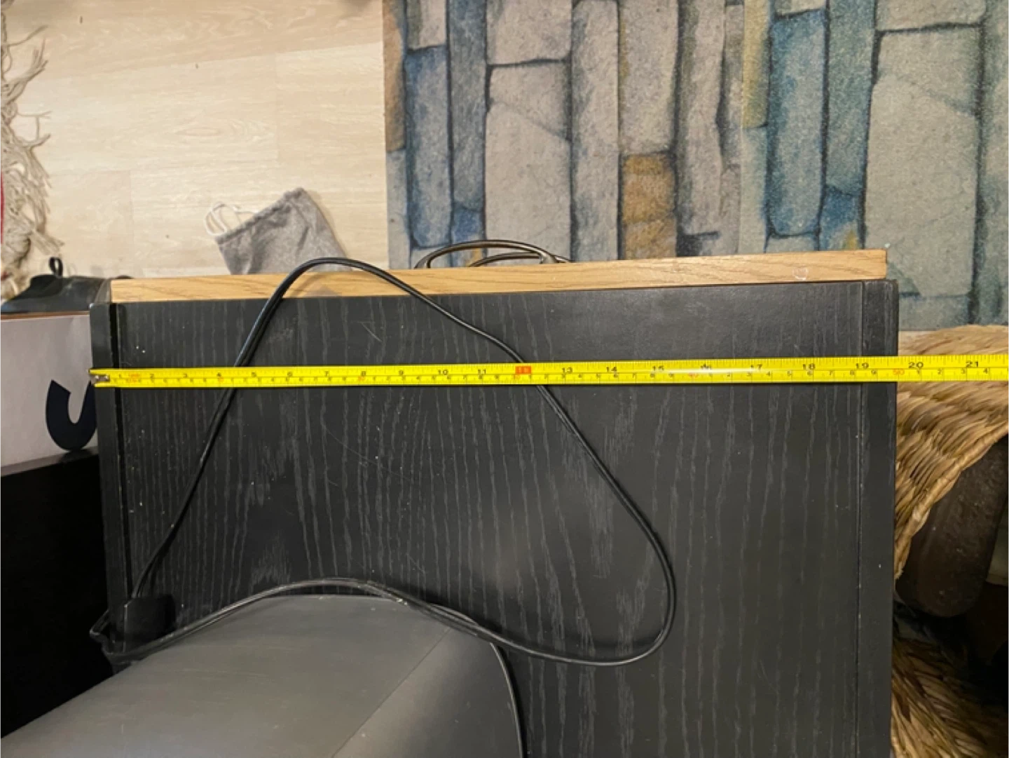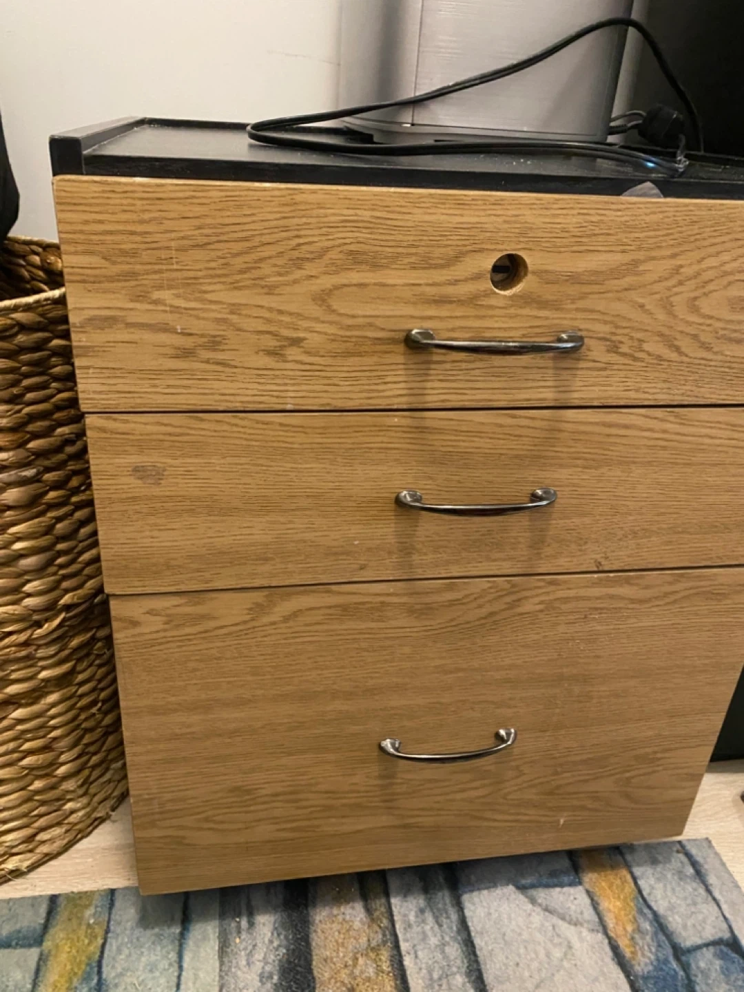 This rolling file cabinet features three drawers with metal handles. It's made of wood composite with a black top and oak-finished drawer fronts. The cabinet is approximately 20 inches tall, 15 inches wide, and 20 inches deep.