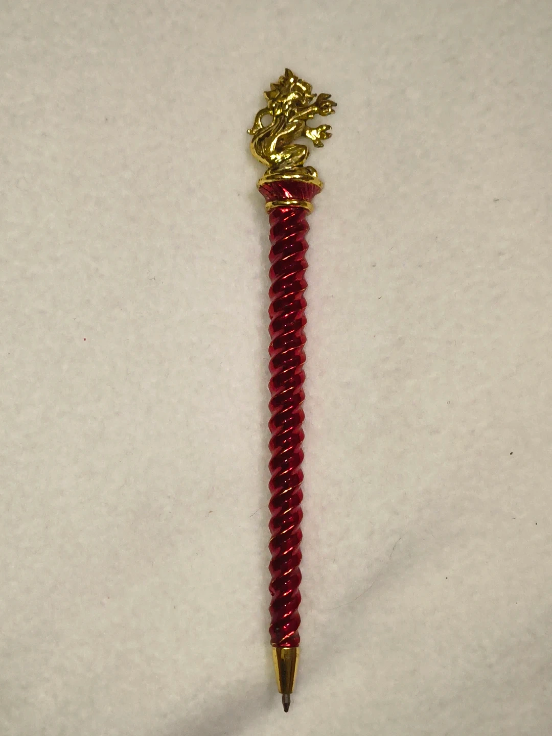 Official Warner Bros licensed Harry Potter novelty pen with gold dragon topper and red spiral shaft. Comes in original Harry Potter presentation box.