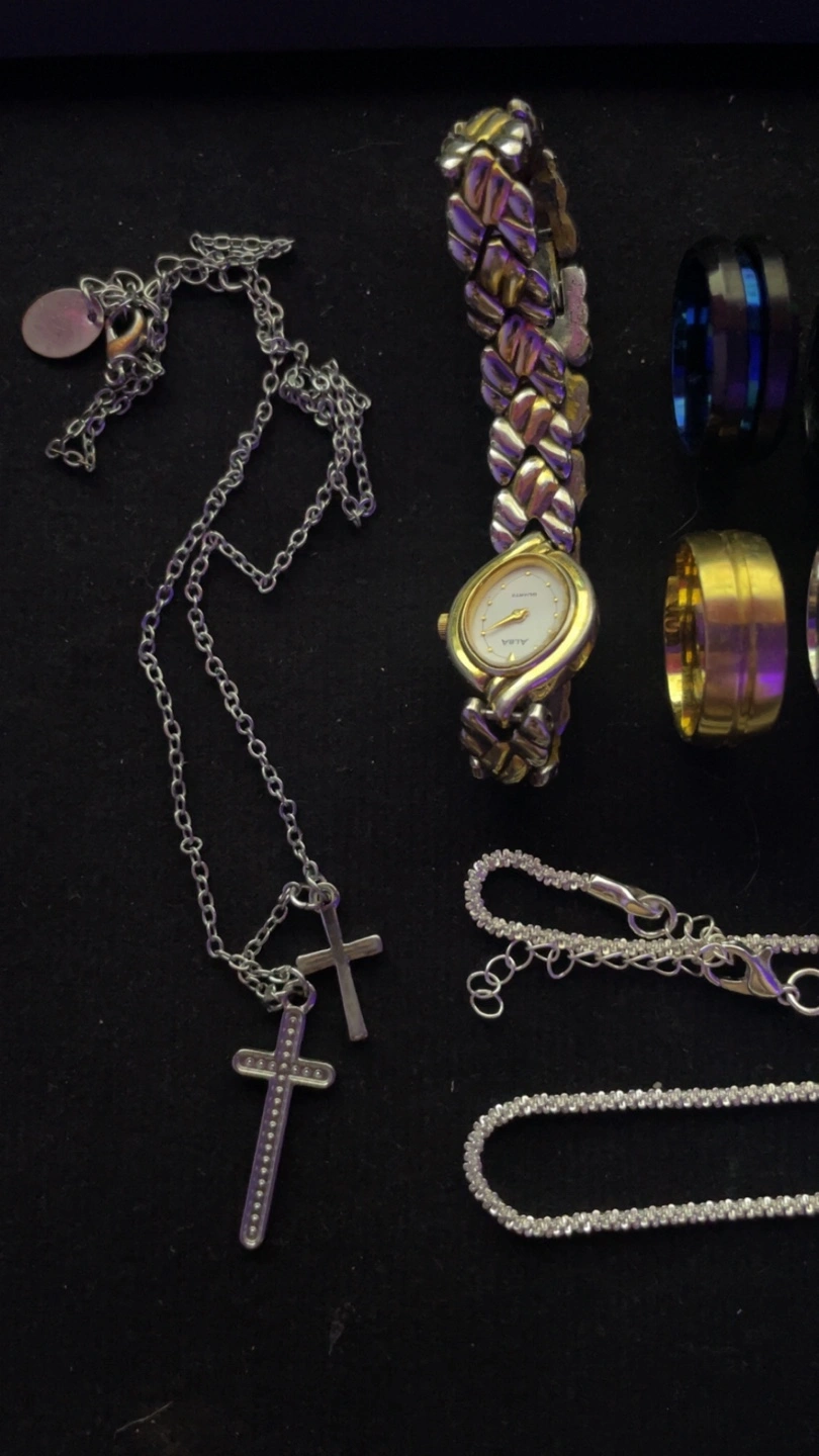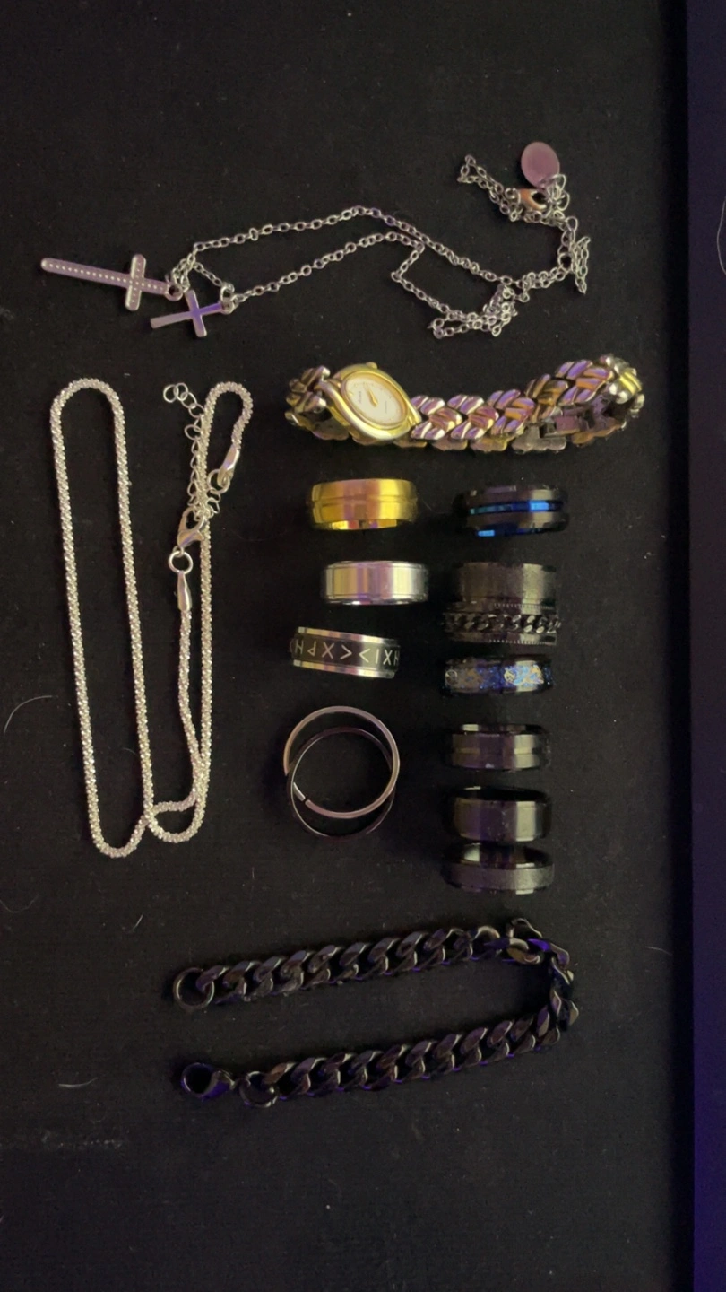 Selling a bundle of assorted jewellery, including necklaces, rings, a bracelet and a watch. All items are in good condition and ready for a new home!