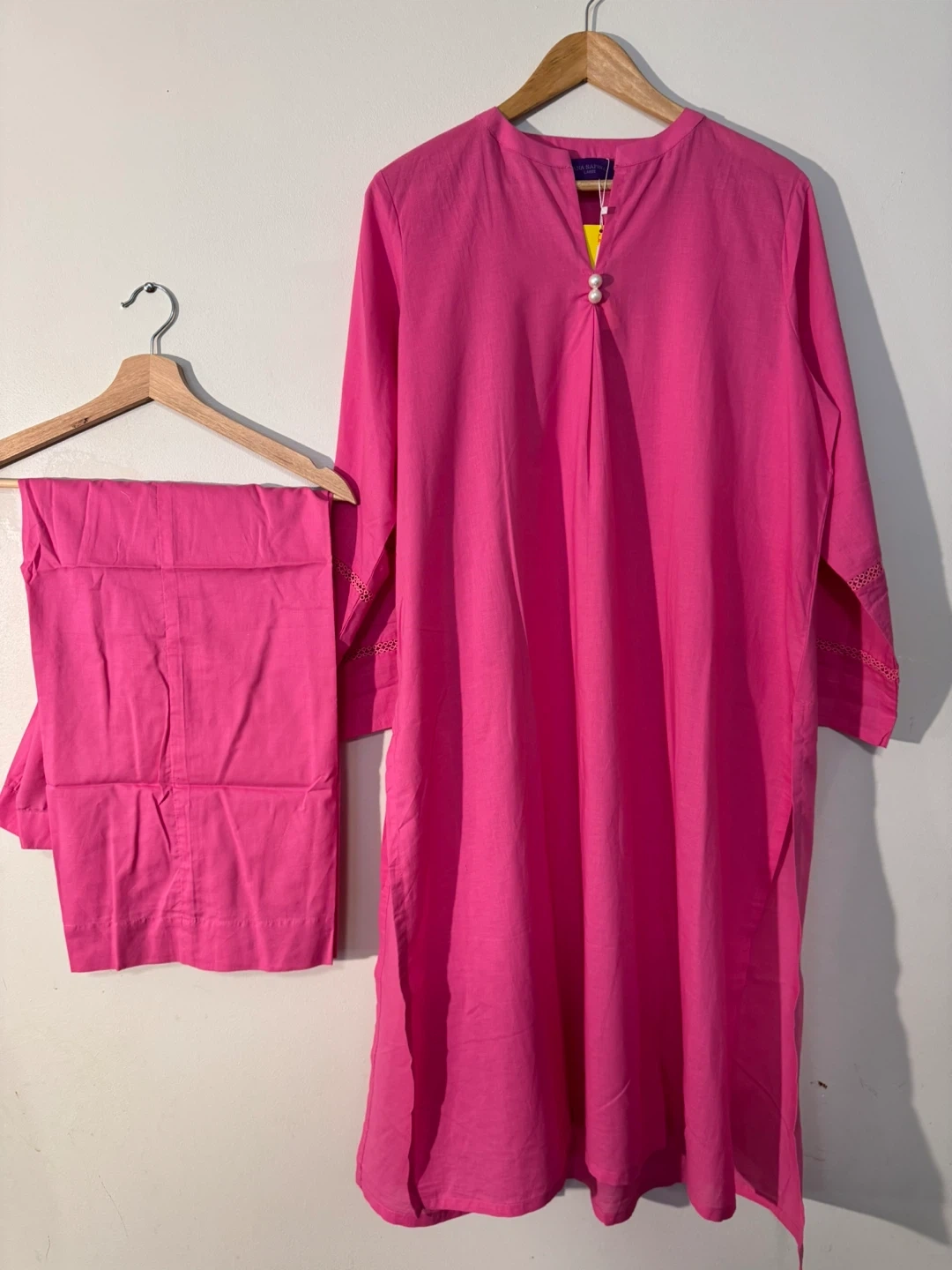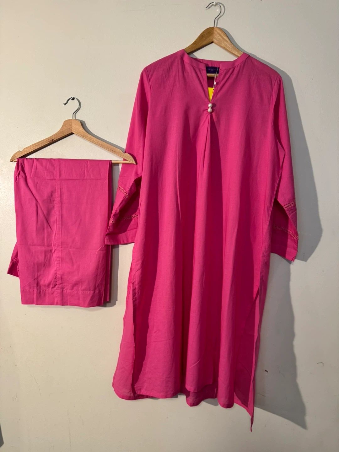 This is a brand new with tags Rana Safin salwar kameez. It's a beautiful bright pink colour. The set includes the tunic and pants. Perfect for a special occasion or everyday wear!