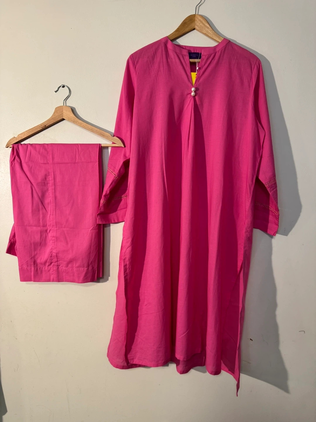 This is a brand new with tags Rana Safin salwar kameez. It's a beautiful bright pink colour. The set includes the tunic and pants. Perfect for a special occasion or everyday wear!