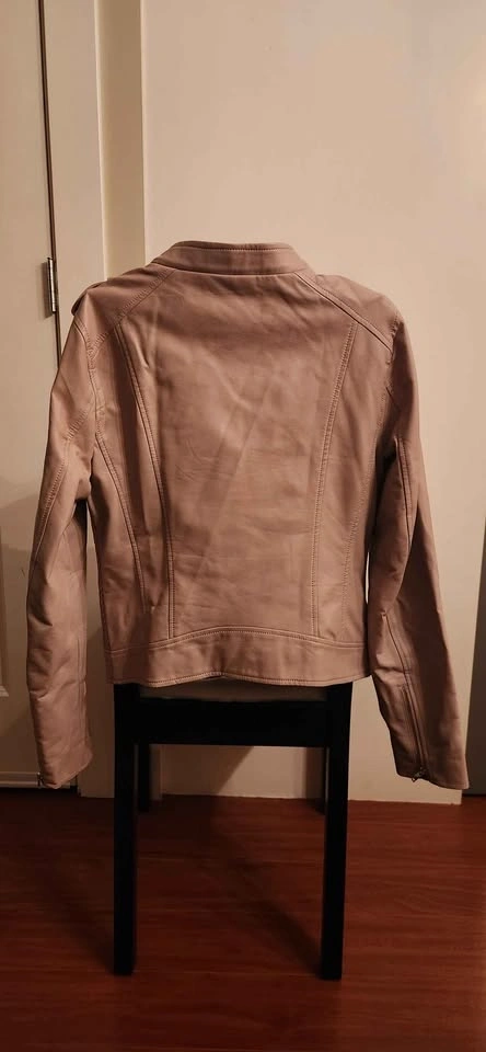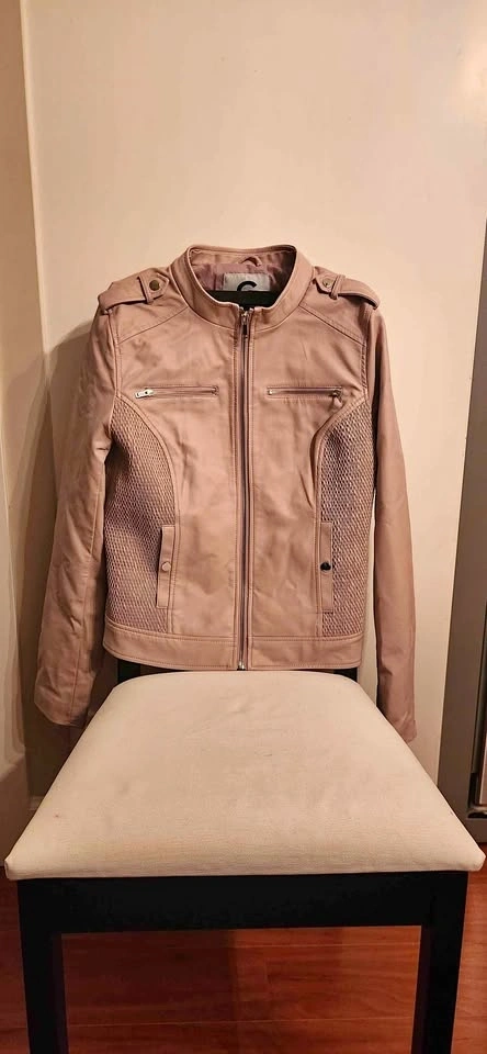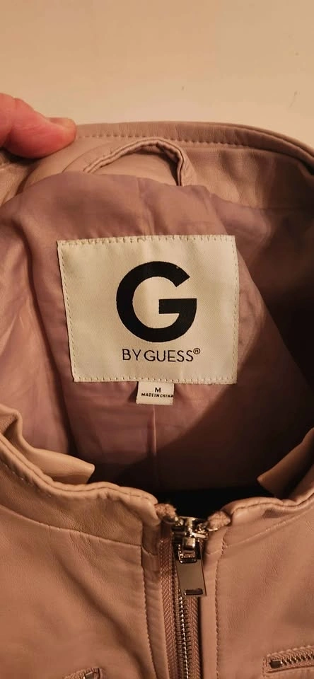 Ladies medium Guess jacket. Soft pink in colour. Purchased and only worn for a few months. Style has simply changed and not longer interested in wearing this jacket. Buttons for main pockets still snap in place. The main jacket zipper still works. The two upper zippers are not actual pockets!