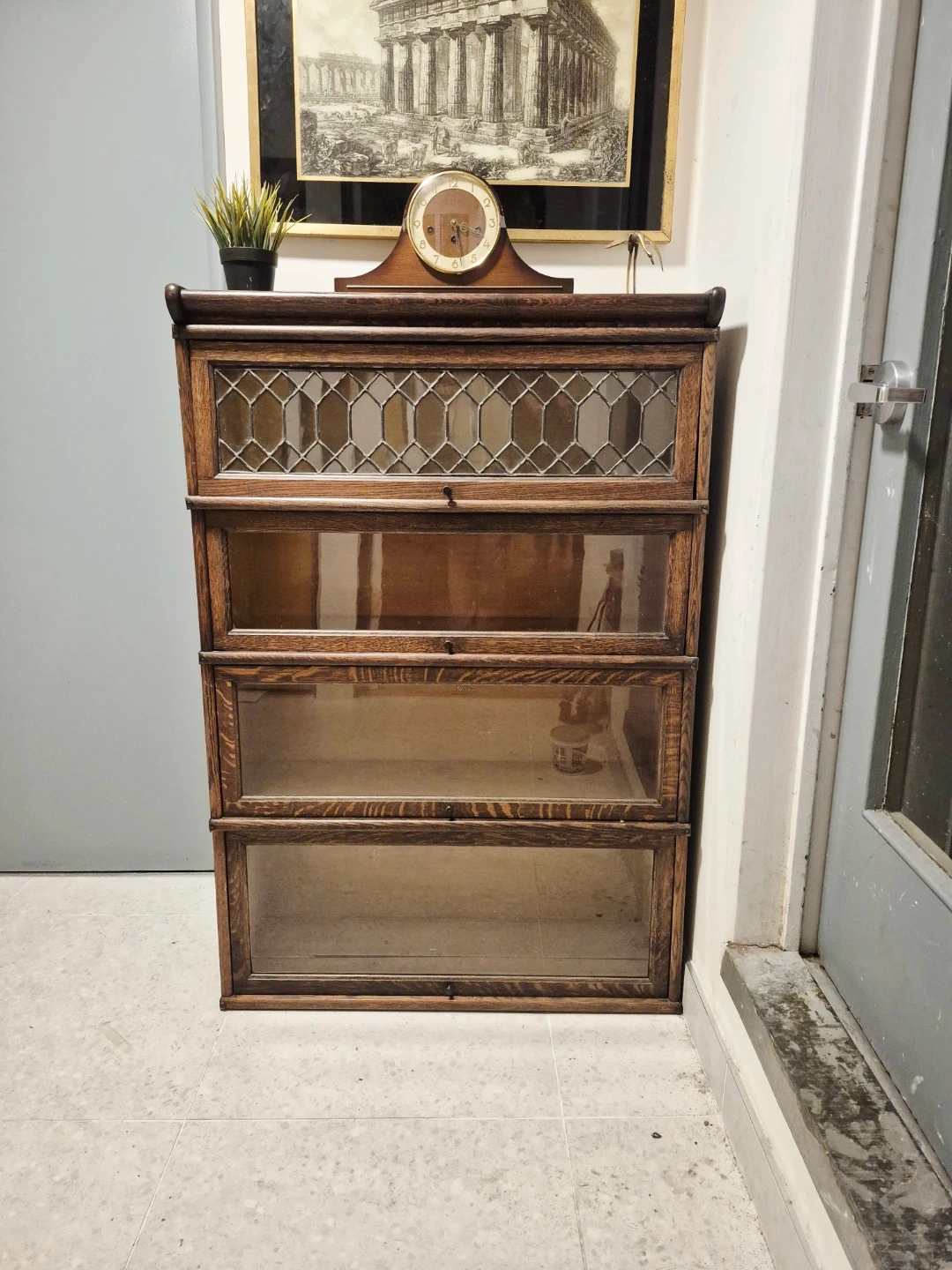 This beautiful antique barrister bookcase is crafted from rich oak wood. It features four stacked sections with glass front doors and intricate patterned glass on the top section. Its classic design makes it a charming addition for displaying books or collectibles. Perfect for a study or living room needing a touch of vintage style!
