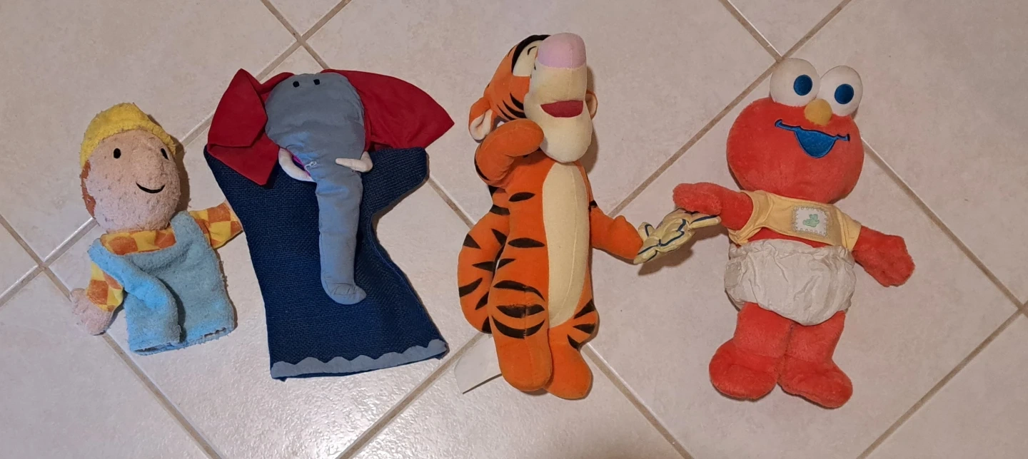 This lot includes Bob the Builder puppet, Tigger, Elmo, and an elephant hand puppet. They're made of soft plush material and are perfect for imaginative play. Great for kids who love these characters!