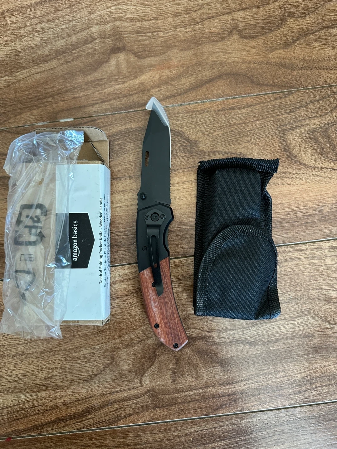 Amazon Basics tactical folding pocket knife. It features a wooden handle and includes a black nylon sheath. The knife is in its original packaging. The blade is about 8 meters long.