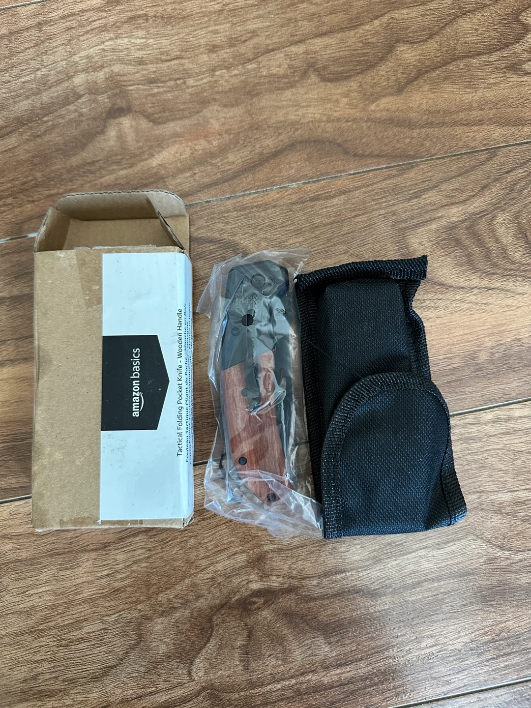 Amazon Basics tactical folding pocket knife. It features a wooden handle and includes a black nylon sheath. The knife is in its original packaging. The blade is about 8 meters long.