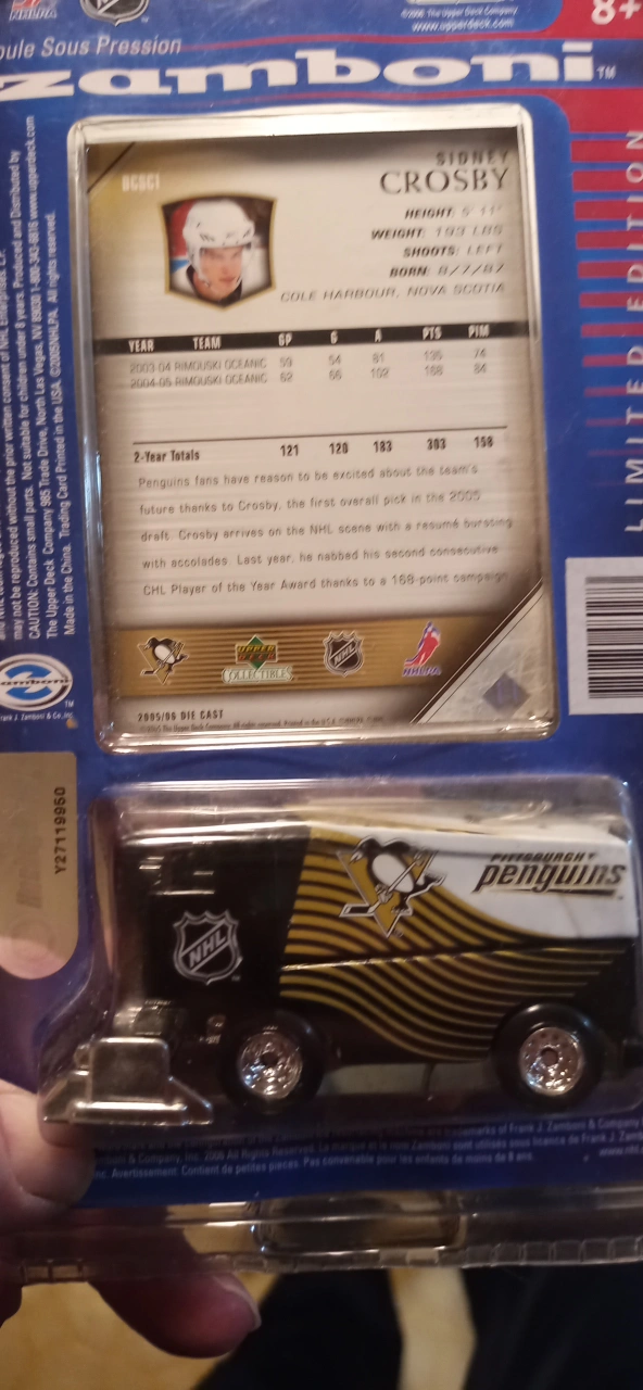 Sidney Crosby card with the Pittsburgh Penguins Zamboni set. It's a limited edition collectible. For ages 8 and up. Never opened. The longer u keep it, the more it's worth. This. is a great price. please compare online