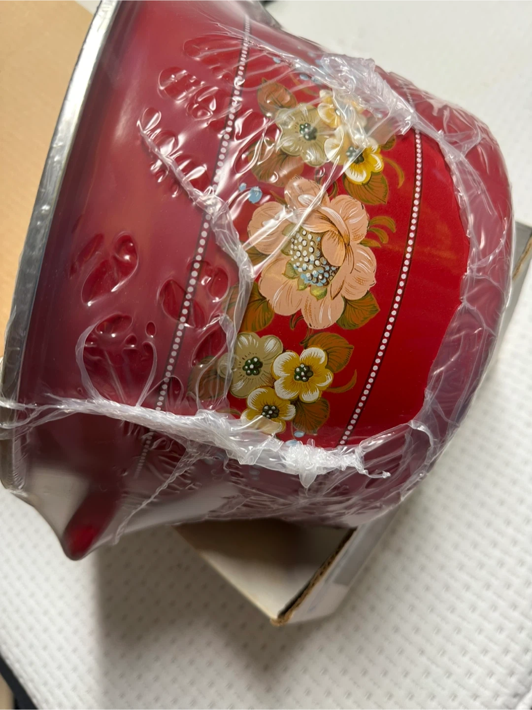 This is a 7-litre enamel pot with a lid. It's made from steel with a stainless steel rim and lid. The pot features a decorative floral design.