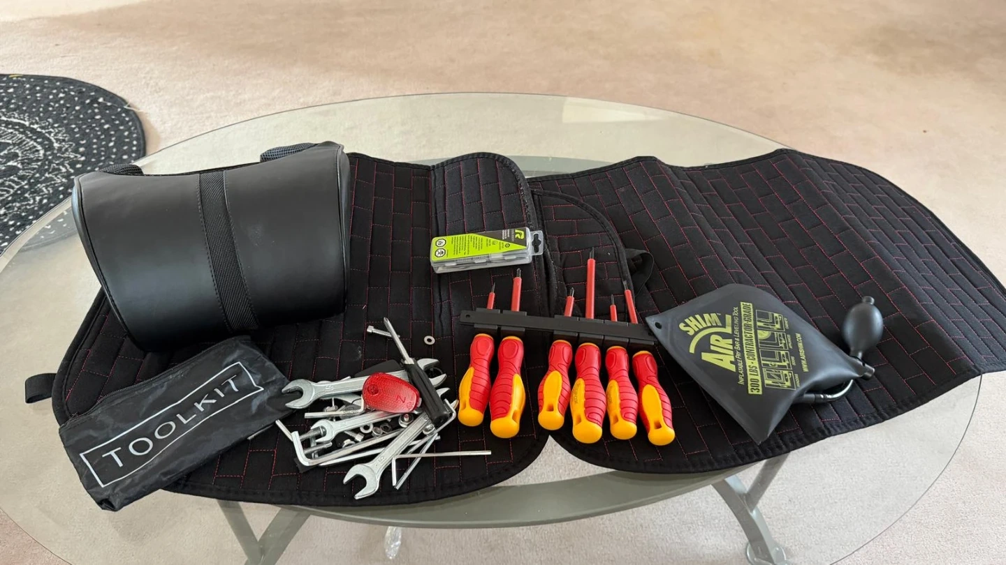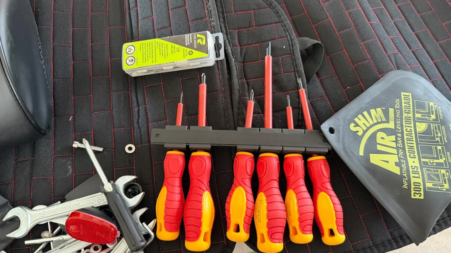 This is a tool kit featuring an assortment of screwdrivers with red and yellow handles. It includes various wrenches and a deflated "SHIM AIR" inflatable shim. The kit comes with a "TOOLKIT" branded bag.