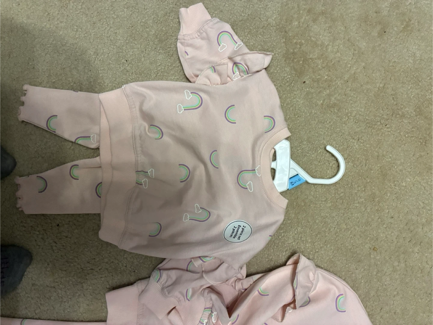 Here's a sweet matching little outfit for your little ones! This George baby set features a pale pink sweatshirt and leggings with a cute rainbow pattern. Size 3T and 0-3months.