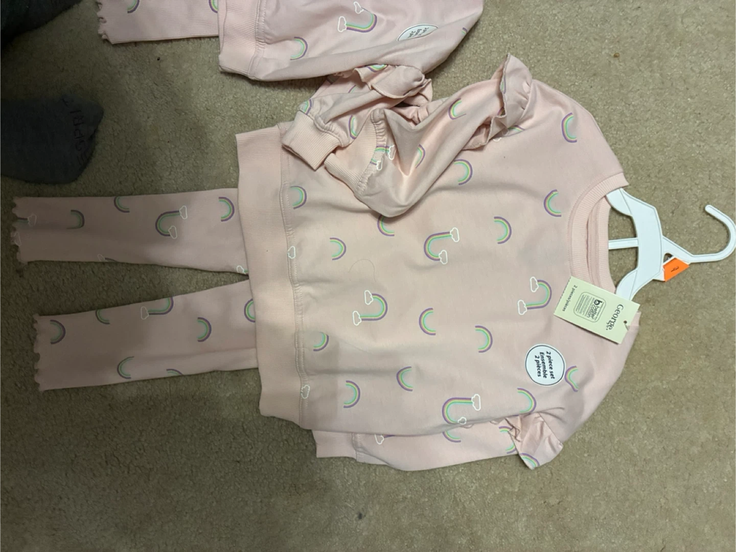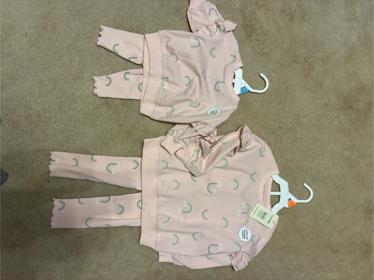 Here's a sweet matching little outfit for your little ones! This George baby set features a pale pink sweatshirt and leggings with a cute rainbow pattern. Size 3T and 0-3months.