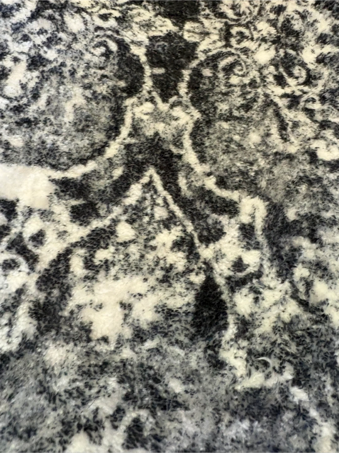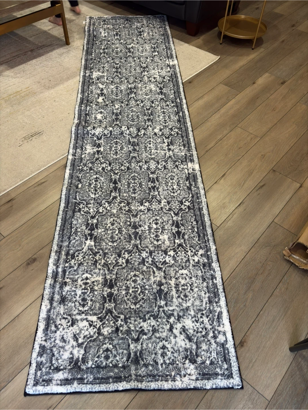 10ft by 2.5 ft This runner rug features a distressed damask pattern in dark black and white. It's a great way to add a touch of style to hallways or entryways. The rug has a soft pile and a non-slip backing.