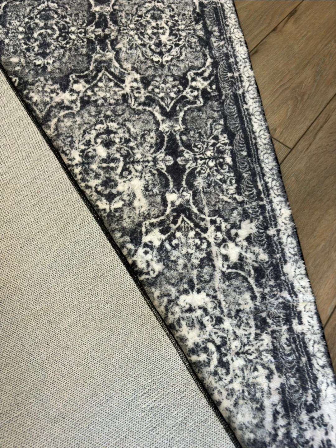 10ft by 2.5 ft This runner rug features a distressed damask pattern in dark black and white. It's a great way to add a touch of style to hallways or entryways. The rug has a soft pile and a non-slip backing.