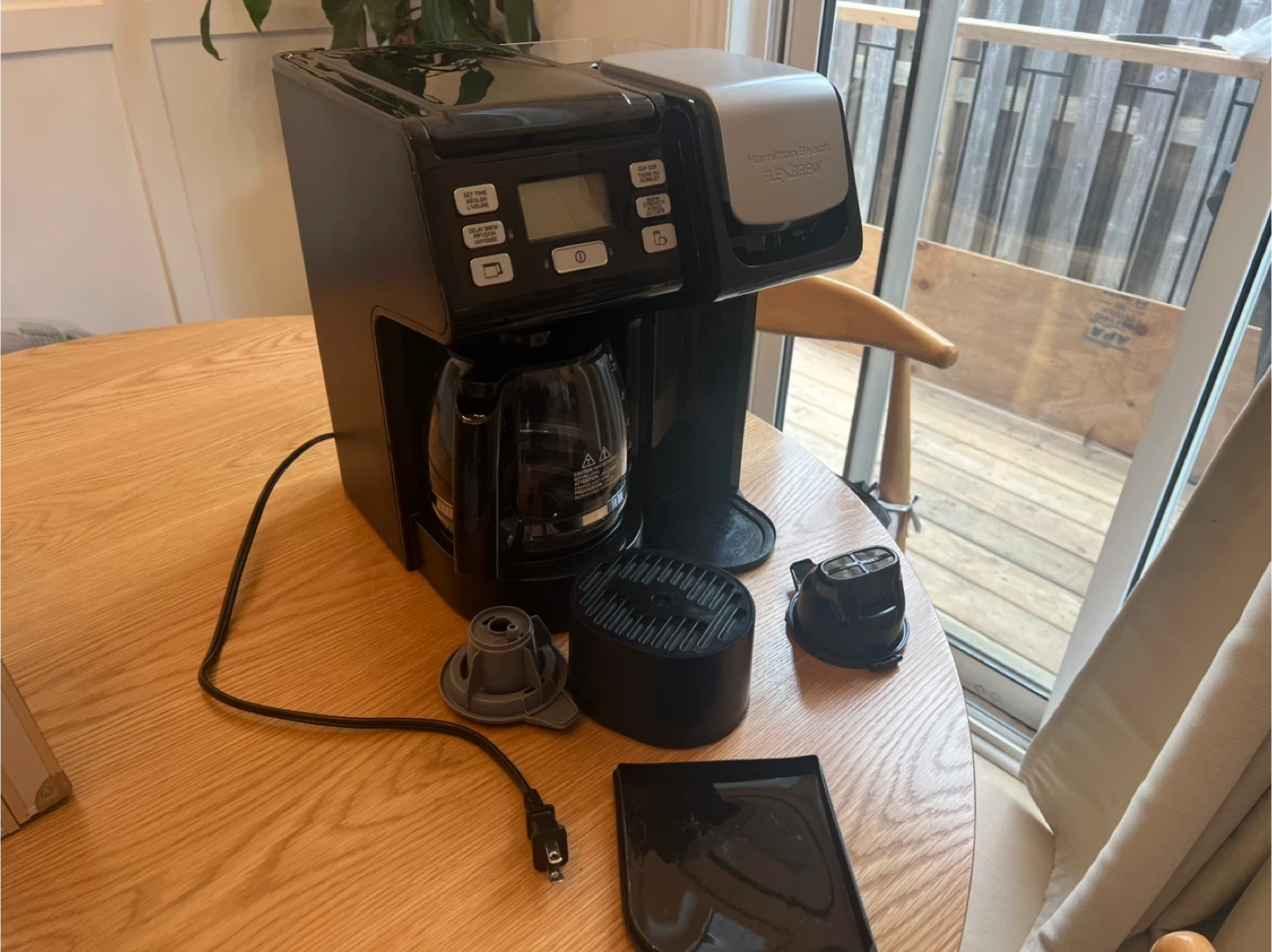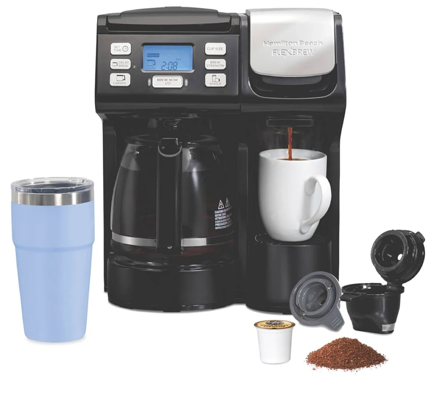 Brew a single cup or a full pot with this Hamilton Beach coffee maker. It includes a carafe and attachments for single-serve brewing. It's perfect for busy mornings or when you want a quick coffee fix. This coffee maker has a digital display and programmable timer.